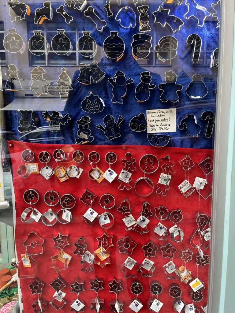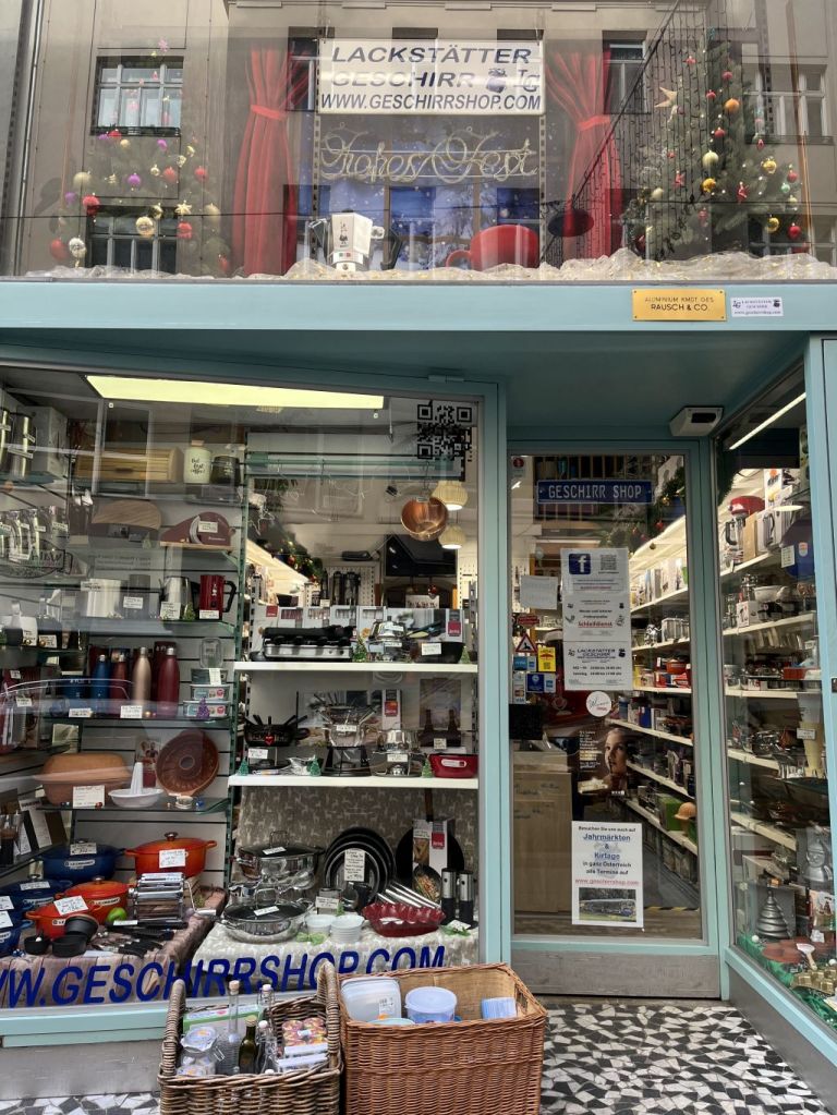 Erster Halt war in dem reichhaltigen, aber wenig geräumigen Geschirrgeschäft in der Wollzeile – Lackstätter Geschirr – wo die Küchenfee Ausstecher für Kekse, Madeleines und eine Silikonmatte für Pralinen erstand. Die Keksezeit kann beginnen! Beim Hinausgehen erkannte die Küchenfee, daß ein anderer Keksausstecher für Rudolph, das rotnasige Rentier, besser geeignet wäre. Umstandslos entnahm die freundliche Verkäuferin den Ausstecher der Vitrine und tauschte ihn um.