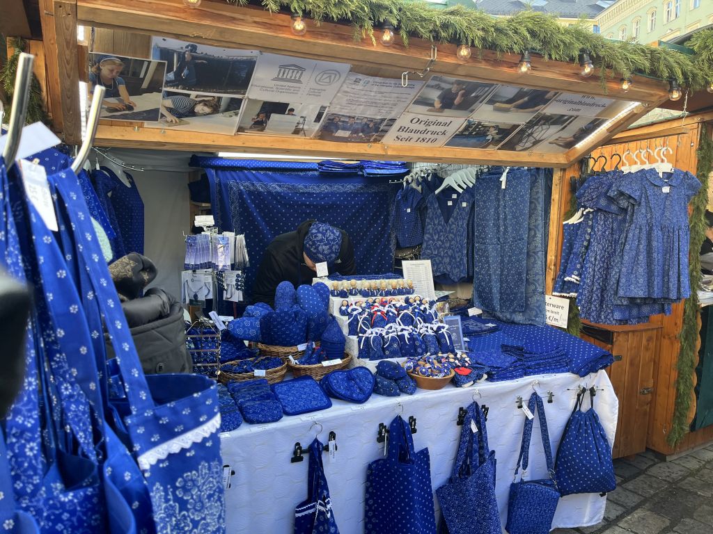 „Blaudruck“-Stand auf dem Christkindlmarkt auf der Freyung. Mit Indigoblau wird die Blue Jeans gefärbt. Aber diese Färbemethode hat eine länger zurückreichende Tradition als es die Blue Jeans gibt.