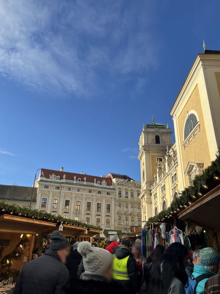 Dort justament, wo sonst der Bauernmarkt residiert, auf der Freyung, hat sich der Christkindlmarkt breit gemacht, wie jedes Jahr zur Weihnachtszeit. Der Bauernmarkt ist umgezogen, nach Vis-a-vis vom Austriabrunnen. Nach dem Besuch beim Thum,- Gemüse- und Käsestandl und einem Abstecher bei Dr. Kottas, wo wir uns aufwärmten – es hatte knapp über 0°C – gingen wir auf den Christkindlmarkt und genehmigten uns den ersten Punsch dieses Jahr.