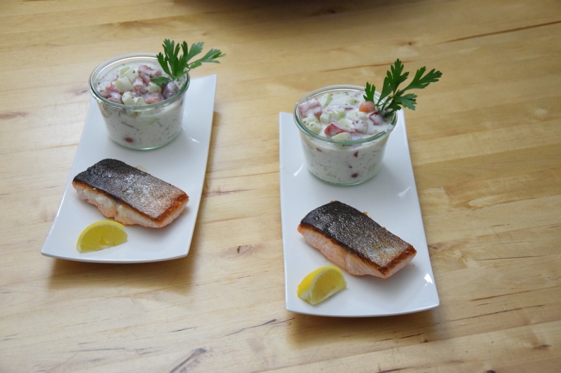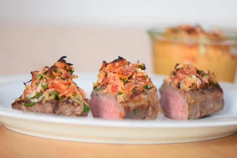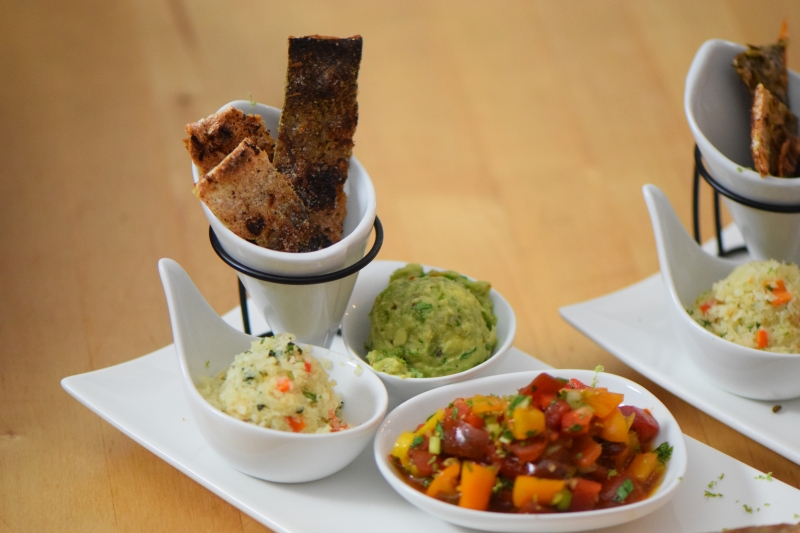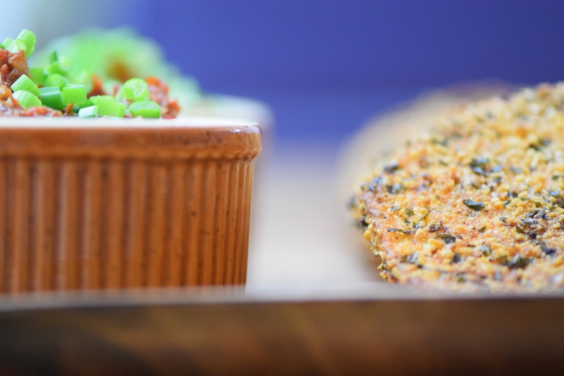 Sellerie-Schnitzel mit Süßkartoffel-Dip und Tomaten-Dip, wobei die Sellerieschnitzel mit einer speziellen Panade aus entöltem Mandelmehl mit Chili gemacht wurden. Zum ersten Mal kam das „Soßen- und Dressing“-Kochbuch von Mark Sisson zum Einsatz.