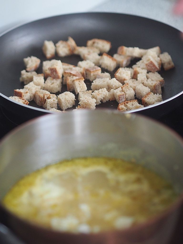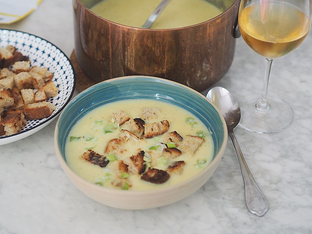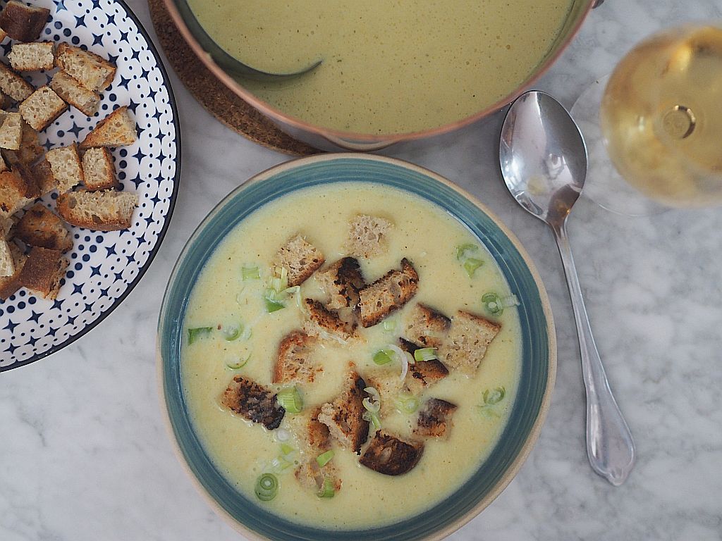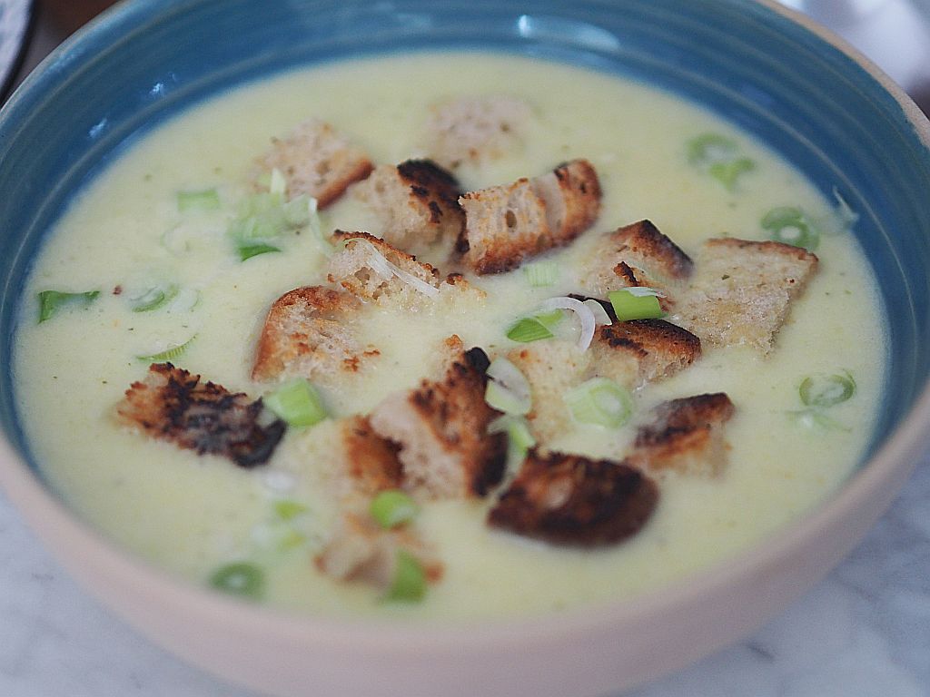 3 kleine Zwiebel und 4 Knoblauchzehen klein würfeln. 2 geschälte Erdäpfeln würfeln, 2 EL Butter in einer Kasserolle auslassen, Zwiebel, Knoblauch und Erdäpfel hineingeben und anschwitzen. Mit einem 1/8 Weißwein ablöschen, einköcheln und dann mit 1 L Gemüsesuppe aufgießen, ein paar Minuten leise köcheln lassen und dann 250 g Graukäse hineingeben und Herd zurückdrehen und ein paar Minuten unter ständigem Rühren köcheln lassen, mit dem Stabmixer fein pürieren. Schlagobers dazugeben und mit Muskatnuß abschmecken. Mit Brotcroutons servieren.