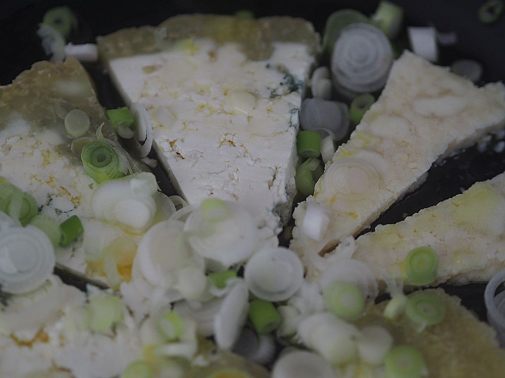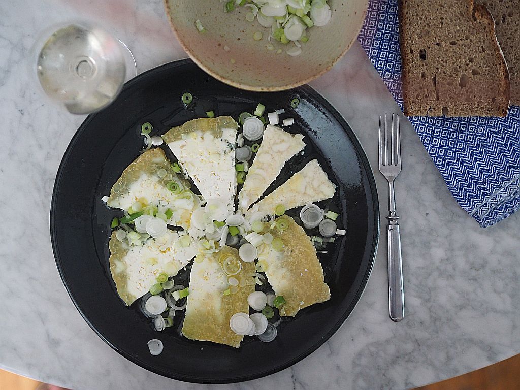 Graukas in Scheiben auflegen und mit einer Marinade aus Essig und Öl reichlich beträufeln. Mit Jungzwiebel und Brot (Mauracher Strutzen) servieren