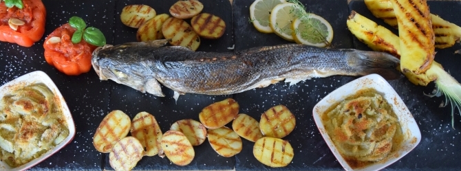 Gegrillter Wolfsbarsch und gegrillte Ananas
