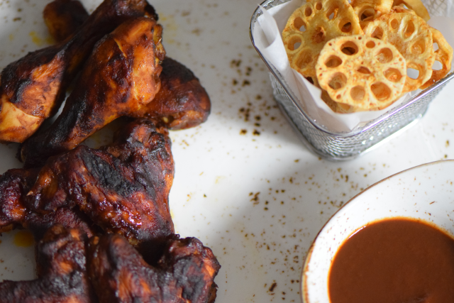 Die Hühnerflügerl und -schenkel werden in einer kräftigen Grillsauce am Vortag eingelegt und dann im Backrohr gegrillt. Dazu gibt es Friseésalat mit in Honig karamellisierten Pekannüssen und gebratenes Roggenbrot, auch vom Vortag. Weiters frittierte Lotoswurzel.