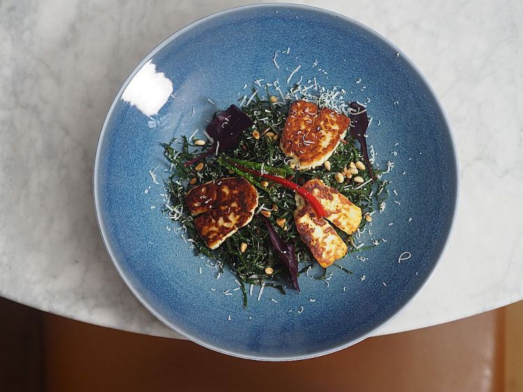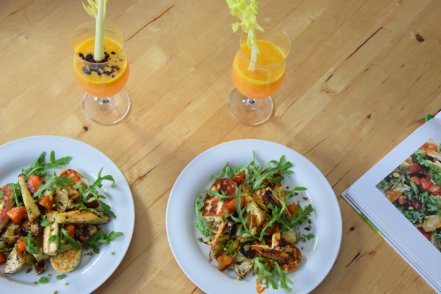 Ein Salat kombiniert mit einem extra dafür angefertigten Getränk. Ohne Zucker wird Apfel mit gezesterten Orangenschalen und geräuchertem Paprikapulver verkocht. Anschließend wird dieses Apfelkompott mit gerösteten Pastinaken, Sellerie und Halloumi vermengt. Dazu wird ein leichter Drink serviert aus frisch gepresster Orange, Apfel und Sellerie mit etwas darüber gestreutem Pfeffer.