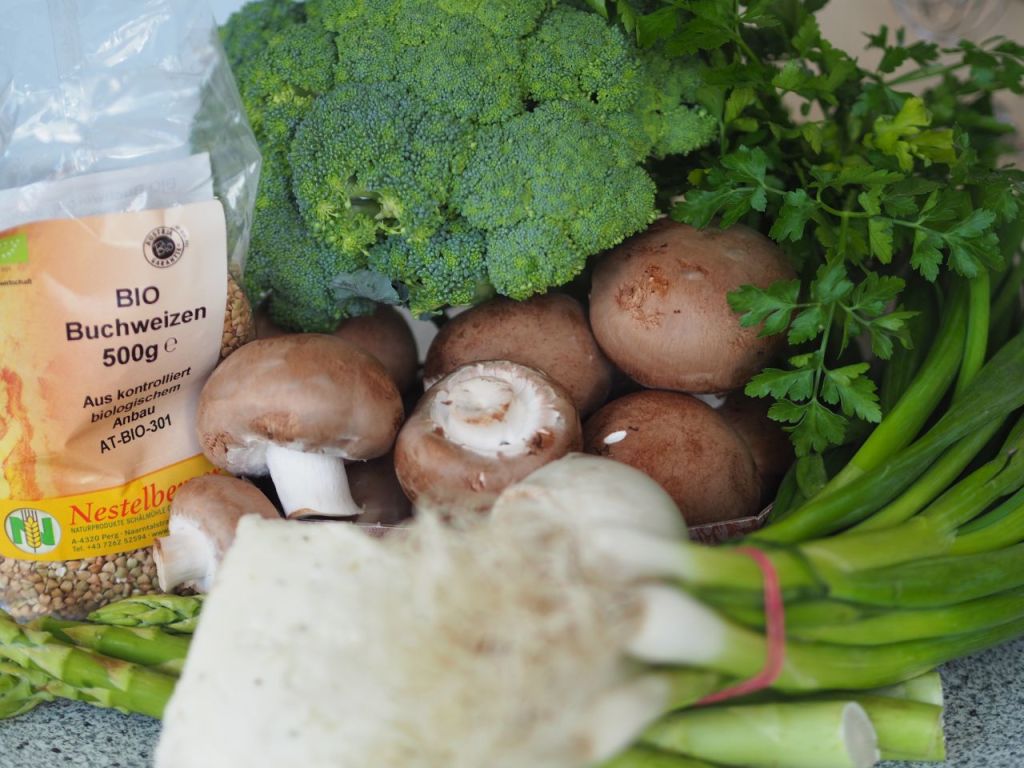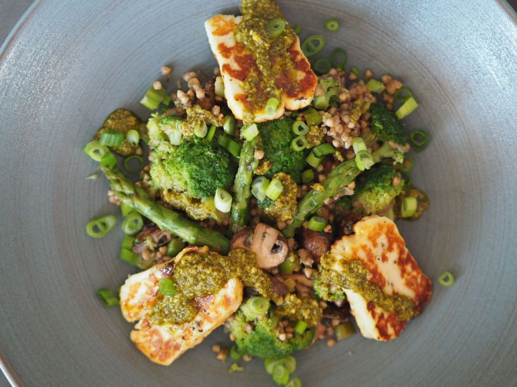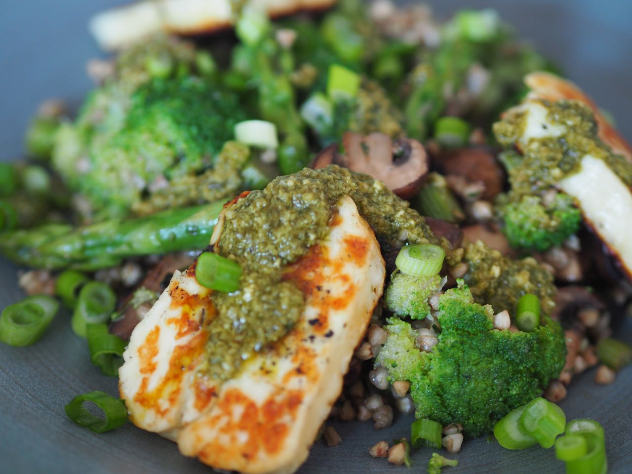Zwiebel in Olivenöl anschwitzen, Buchweizen dazu geben, mit Rinderbrühe aufgießen, 15 Minuten köcheln lassen, in den letzten 5 Minuten Spargel in mundgerechte Stücke schneiden und dazu geben, die in einer separaten Pfanne angebratenen Champignons und die blanchierten Brokkoli ebenfalls dazu geben. Gehackte Petersilie einrühren. Mit gegrilltem Halloumi und Basilikum-Pesto servieren. Mit in feine Scheiben geschnittenen Jungzwiebel bestreuen.
