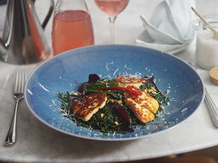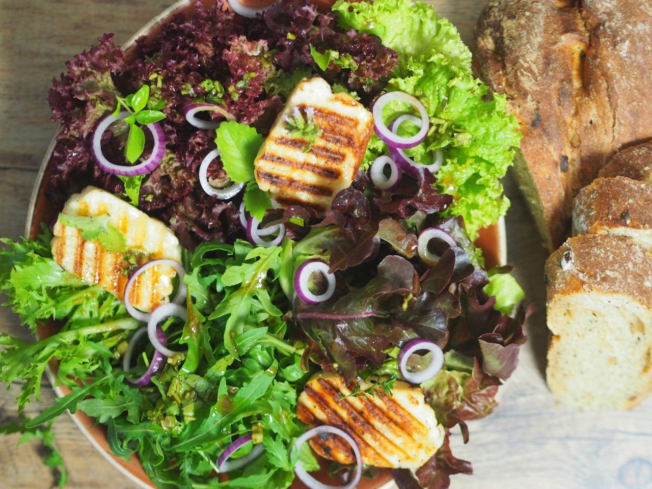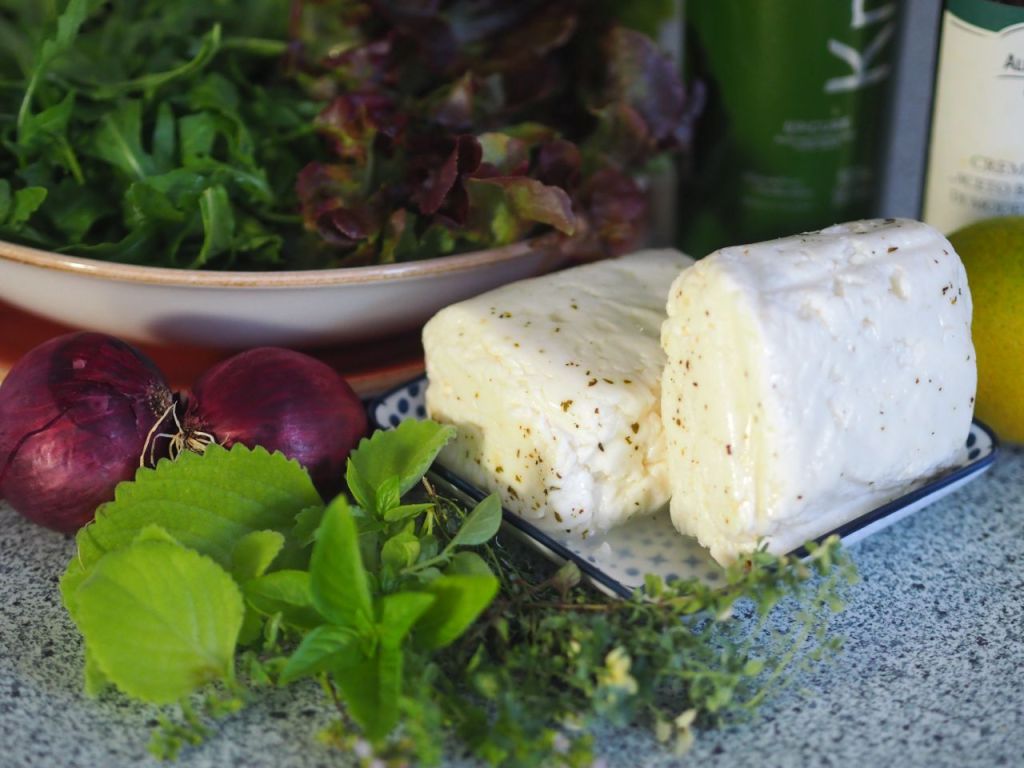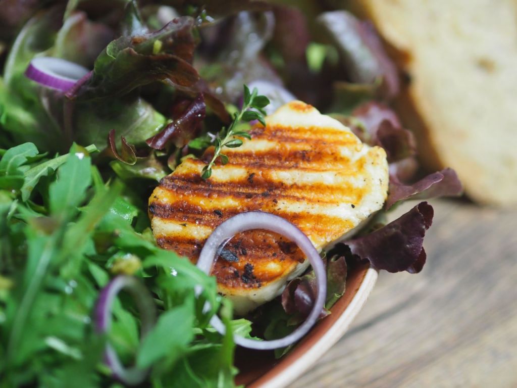 Zitronensaft, Balsamicoessig, Olivenöl, Salz, fein gehackten Thymian, Jamaika-Thymian, Basilikumblätter verrühren. Halloumikäse in Scheiben schneiden und grillen. Mit einer Salatmischung aus Lollo Rosso, Lollo Bianco, Rucola, etc. servieren.