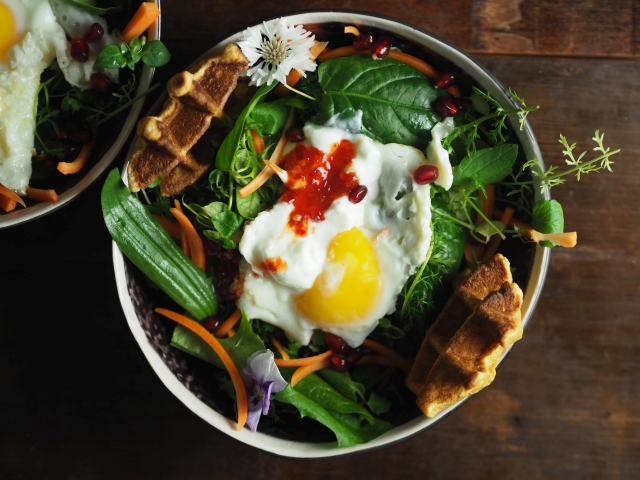 Zucchini und der grüne und der weiße Teil der Frühlingszwiebeln werden gebraten und mit Tomatenmark und Harissa verrührt und abgelöscht, das Omelette in quadratische Fleckerl geschnitten. Den Salat mit Kirschtomaten bestreuen und mit Zitronensaft und mediterranen Kräutern abschmecken.