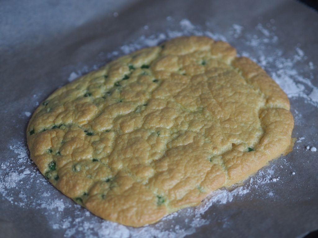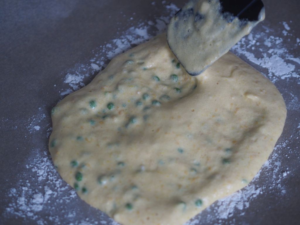 Eiklar mit Salz mit dem Handmixer zu steifem Schnee schlagen. Mehl und Dotter unterheben. Die gekochten Erbsen daruntermischen. Das Backblech haben wir mit dem heruntergetropften Fett von den Schweinsbrüsteln eingefettet und bemehlt. Die Masse aufstreichen und bei 180° 12 Min. backen. Auskühlen lassen. Aufschneiden.