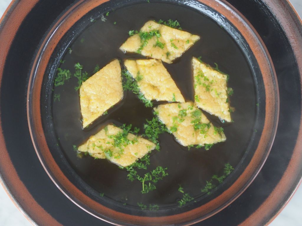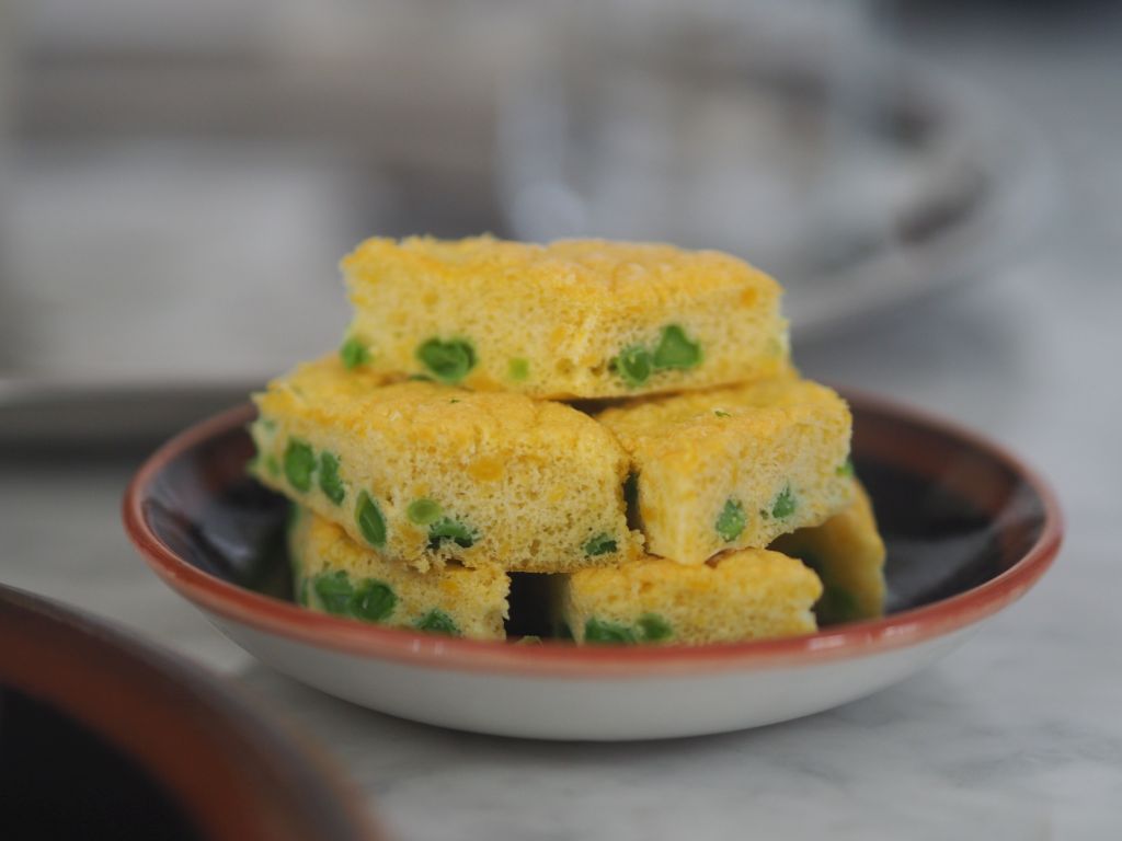 Zwei Semmeln von letzter Woche in Scheiben aufschneiden. In Milch einweichen. Zwei Eier trennen, den Dotter mit 30g weicher Butter schaumig schlagen. Das Eiweiß mit einer Prise Salz steif aufschlagen. In der Zwischenzeit die weich gewordenen Semmeln ausdrücken. Die Semmeln zur Dotter-Butter-Mischung geben. Salz, Muskatnuß und gehackte Petersilie dazugeben, verrühren. Mit dem Handrührgerät verrühren. Das steif geschlagene Eiweiß mit dem Gummihund unterheben. Zum Schluß die Erbsen einstreuen. Alles in einer mit Backpapier ausgelegten ofenfesten Form verteilen. Bei 180° etwa 10 bis 15 Min. backen. Herausnehmen und auskühlen lassen. In Rauten schneiden.