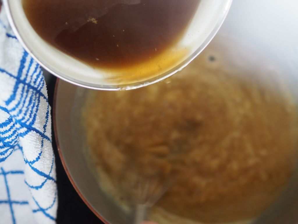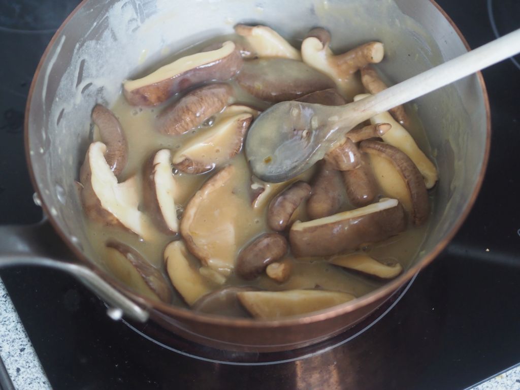 2 feingehackte längliche Schalotten in 80 g Butter anlaufen lassen, 40 g Mehl dazu geben, einige Zeit köcheln lassen und verrühren, etwa 15 Min. bis der Mehlgeschmack weg ist. Mit etwa ½ L Rindsuppe aufgießen. Aufgeschnittene 200 g Shiitake-Pilze dazugeben, mit Salz abschmecken.