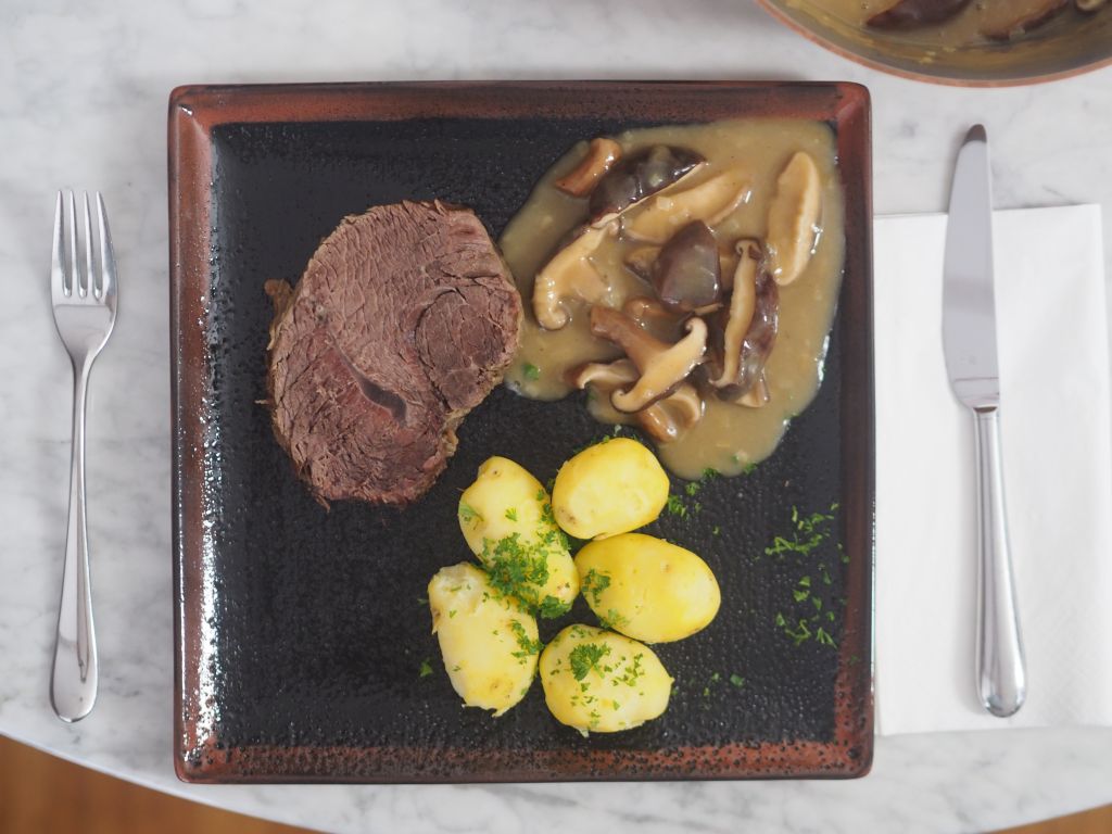 Von der Art des Rindfleisches hängt die Zuspeis ab, da das Meisl mager ist, kommt also eine Soß‘ dazu: Shiitake-Pilzsoß auf die Wiener Art, dazu gekochte Erdäpfel.