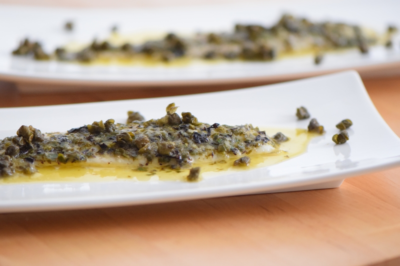 Seezungenfilets mit frittierten Kapern in brauner Butter aromatisiert mit einem Nori-Blatt sowie Ingwer, Petersilie und Zitronensaft.