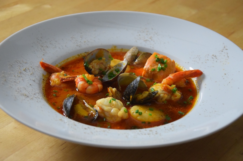 Eine Bouillabaisse mit Miesmuscheln, Teppichmuscheln, Garnelen, Lachs, Jakobsmuscheln und Seeteufel.