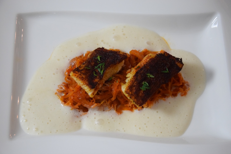 und Welschrieslingschaum. Der Paprika wird fein püriert und der Saft davon zum Sauerkraut und Paprikapulver gegeben und sanft geschmort. Aus den Karkassen des Zanders wird ein Fischfond gemacht, der für einen Welschrieslingschaum verwendet wird. So wird der ganze Fisch verwertet.