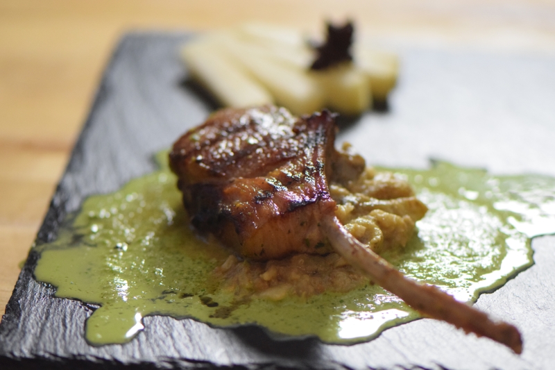 und Poblanosauce und Kohlrabipickles. Das Lammkarree und die Kohlrabi wurden am Tag davor mariniert bzw. eingelegt.