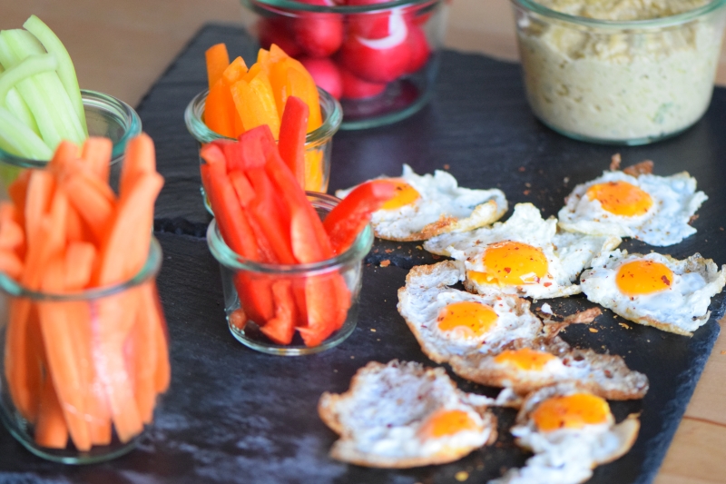 Ein Dip aus einer Sesampaste mit Cashewnüssen und Wirsing, dazu ein paar Wachteleier und Karotten, Paprika, Salatgurke und Radieschen.