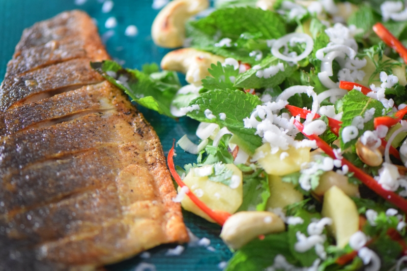 Die Wolfsbarschfilets wurden in der Pfanne gebraten. Der Kokos-Salat war mit Cashew-Nüssen, Minze, Koriander, mariniertem Ingwer und Chili.