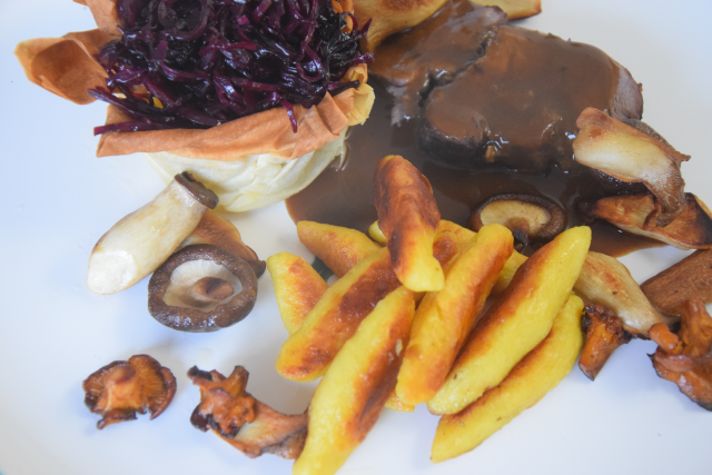 REZEPTUR Mignons vom Damhirsch mit Petersilienwurzelpüree, Chips und Pilzen