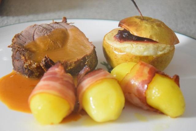 W i l d s o ß e die Hirschknochen im Backrohr bei 200° anbraten. Darauf achten, daß es nicht schwarz wird. In der Zwischenzeit das Fleisch parieren. Die Parüren in der Pfanne scharf anbraten. Suppengrün dazugeben. Große Knochen zerkleinern und alle Knochen dazu geben. Tomatenmark anrösten. Mit Port ablöschen und mit Wasser aufgießen, bis alles bedeckt ist. Lorbeerblatt, Pfefferkörner, Wacholderbeeren, Pimentkörner, Thymian und Petersilien dazu geben und 3 Stunden köcheln lassen. Dann abseihen. Die aufgefangene Flüssigkeit in eine Trennkanne geben. die Soße in einem kleinen Topf auf ein Drittel einköcheln. Zum Schluß ein bißchen Wildpreiselbeeren dazu und mit Butter montieren. P e t e r s i l i e n w u r z e l p ü r e e Petersilienwurzeln schälen. Den dickeren Teil hinten mit dem Hobel in hauchdünne Späne schneiden und in eiskaltes Wasser geben. Den dünneren Teil klein schneiden und in Zitronenwasser mit Salz weichkochen. Abseihen. Mit Schlagobers die gekochte Petersilienwurzel mit dem Standrührgerät pürieren. Mit dem Gummihund durch ein Sieb streichen. Braune Butter dazugeben. Mit Salz und Muskatnuß abschmecken. Warm stellen. Die P e t e r s i l i e n w u r z e l c h i p s abgießen, gut mit Küchenkrepp abtupfen. In heißem Bratolivenöl fritieren. Auf Küchenkrepp legen und warm stellen. A p f e l schälen und das Gehäuse entfernen, in Spalten schneiden. In heißer brauner Butter kurz anbraten. Mit der Soße glacieren. Warmstellen. P i l z e Kräuterseitlinge, Austernpilze und Feldpilze in heißer brauner Butter anbraten und warmstellen. H i r s c h die Filetspitze in Mignons schneiden. In eine Pfanne etwas brauner Butter geben und darin kurz die Mignons rundherum scharf anbraten. A n r i c h t e n Auf einen Teller legen. Mit Soße beträufeln. Und das Fleisch mit einer Garnierung aus gehacktem frischem Thymian, Wacholderbeeren und frisch gemahlenem Pfeffer bestreuen.