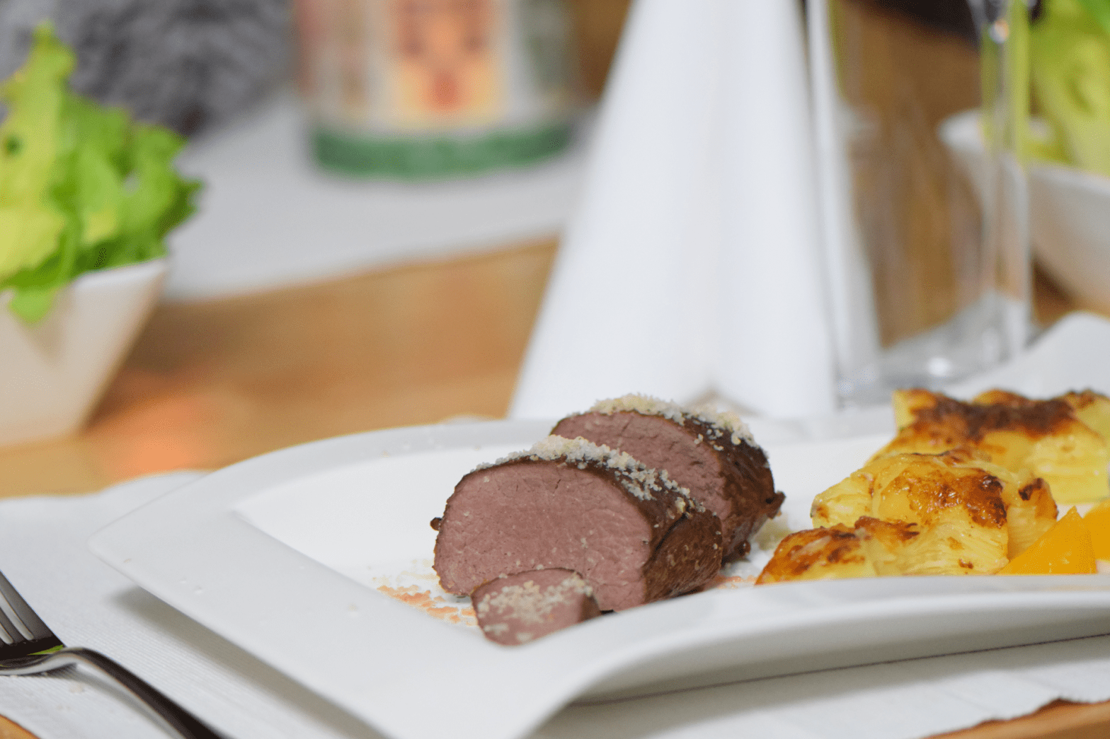 Hirschkalbfilet, gebraten und im Backrohr bei 100 Grad sanft durchgegart, sodann in Orangen-Wacholder-Butter geschwenkt. Darüber Macadamia-Raspeln. Als Beilage ein Erdäpfel-Gratin aus Kipflern in Sherry-Obers-Masse getränkt und überbacken. Als Vorspeise Sizilianischer Orangensalat mit filetierten Orangenspalten beträufelt mit Barolo-Essig und Olivenöl.