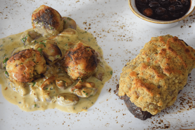 Hirsch mit Speckknödel und Moosbeermarmelad