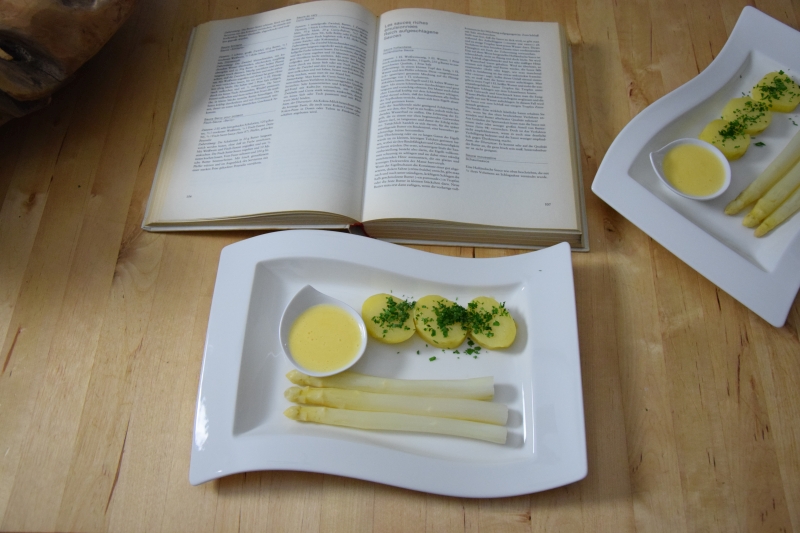 Mit Rosmarin aromatisierter gebratener Lammrücken mit Senf-Hollandaise. Dazu ein Erbsenpürree und frittierte Frühlingsteigchips, sowie Sprossen, die nach Erbsen schmecken. Inspiriert von Alexander Herrmann, AHIQ Küchen IQ 2 Menue, S. 130. Dieses Kochbuch ist im legendären Rolf Heyne-Verlag erschienen, den es mittlerweile leider nicht mehr gibt.