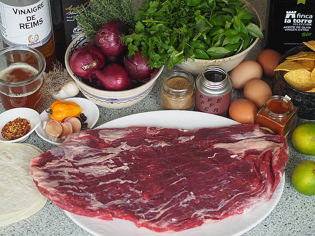 Weitestgehend inspiriert von „Bavette Gorditas mit Chipotle-Hollandaise“, in dem Buch „Smokey Goodness Das ultimative  BBQ-Buch“, von Jord Althuizen, erscheinen im Heel Verlag, 2017 und zu finden auf S. 111. Bavette ist der französische Ausdruck für Flanksteak, Gorditas ist „mexikanischer Straßenslang“ und bedeutet „molliges Mädchen“, „diese kleine weiche Tortilla hat ihren Namen vermutlich daher bekommen“ behauptet das Buch. Sucht man im Rezept nach den Gorditas, wird man nur in der Zutatenliste fündig, stutzig geworden, forscht man unweigerlich nach und findet heraus, dass Gorditas nur dicklich („chubby“) bedeutet und eine mexikanische Spezialität ist, nämlich gefüllte Tortillas, davon ist aber in diesem Rezept nicht die Rede. Tortillas, aber ungefüllte, werden als Beilage verwendet. Offenbar hat man den mexikanischen Straßenslang bemüht und eine weitgeholte Mutmaßung angestellt, um einen sexistischen Aufhänger zu finden, der die Neugier auf das Buch wecken soll. Hat man das Buch erst einmal gekauft, stellt sich heraus, es ist nichts dahinter. Doch dann ist es zu spät. Man versteht die Absicht und ist verstimmt. Wie auch immer, das Rezept hat uns trotzdem gefallen. Beim Durchlesen haben wir uns gedacht, das können wir besser und so kam es zu diesem wunderbaren BBQ-Gericht.