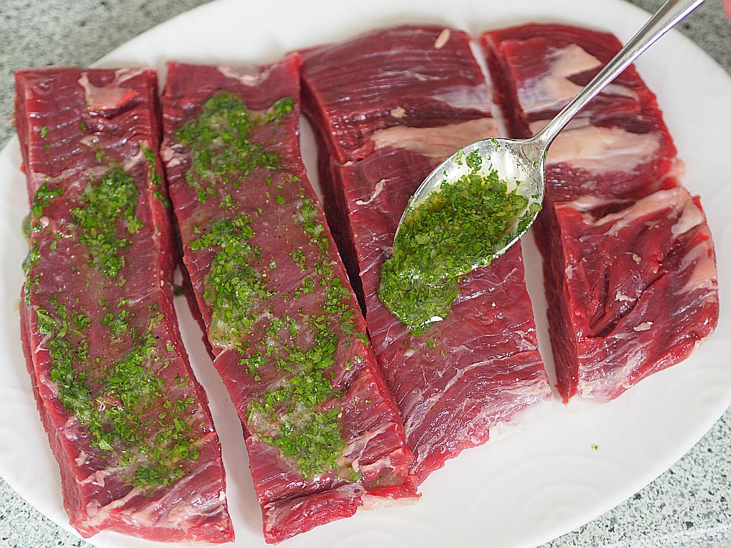 Flanksteaks sind ja von Natur aus höchst geschmackvoll und eignen sich bestens zum maßvollen Marinieren, der Eigengeschmack des Flanksteaks kann es damit aufnehmen. Dieses „Steak“ ist nicht vom Rücken, sondern vom Bauch des Rindes, es ist aber von der Zartheit her mit einem Steak „von da oben“ durchaus vergleichbar, wenn nicht gar überlegen, denn geschmacklich ist es aromatischer. Man fragt sich, warum man nicht überhaupt den Bauchlappen bevorzugt. In der Anschaffung ist es günstiger als die sogenannten Prime Cuts, was in der Zeit des Sparens, in der wir leben, wohl eine ausschlaggebende Rolle spielen wird.