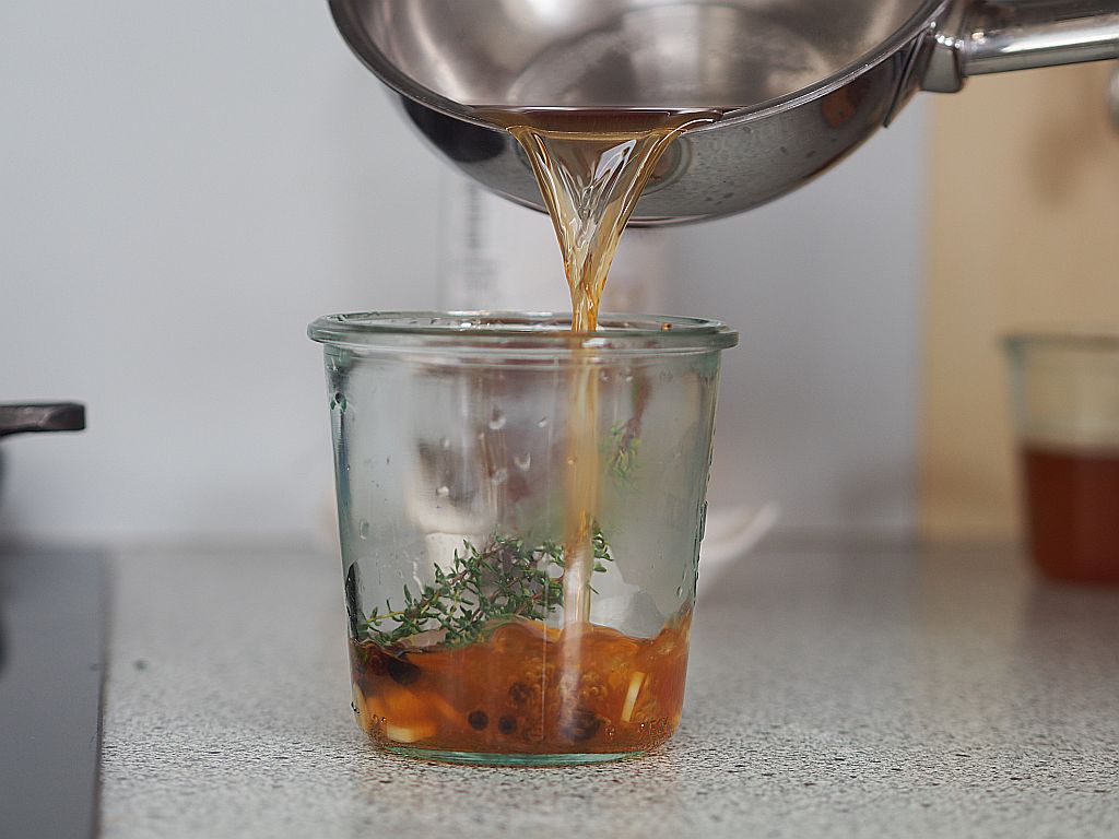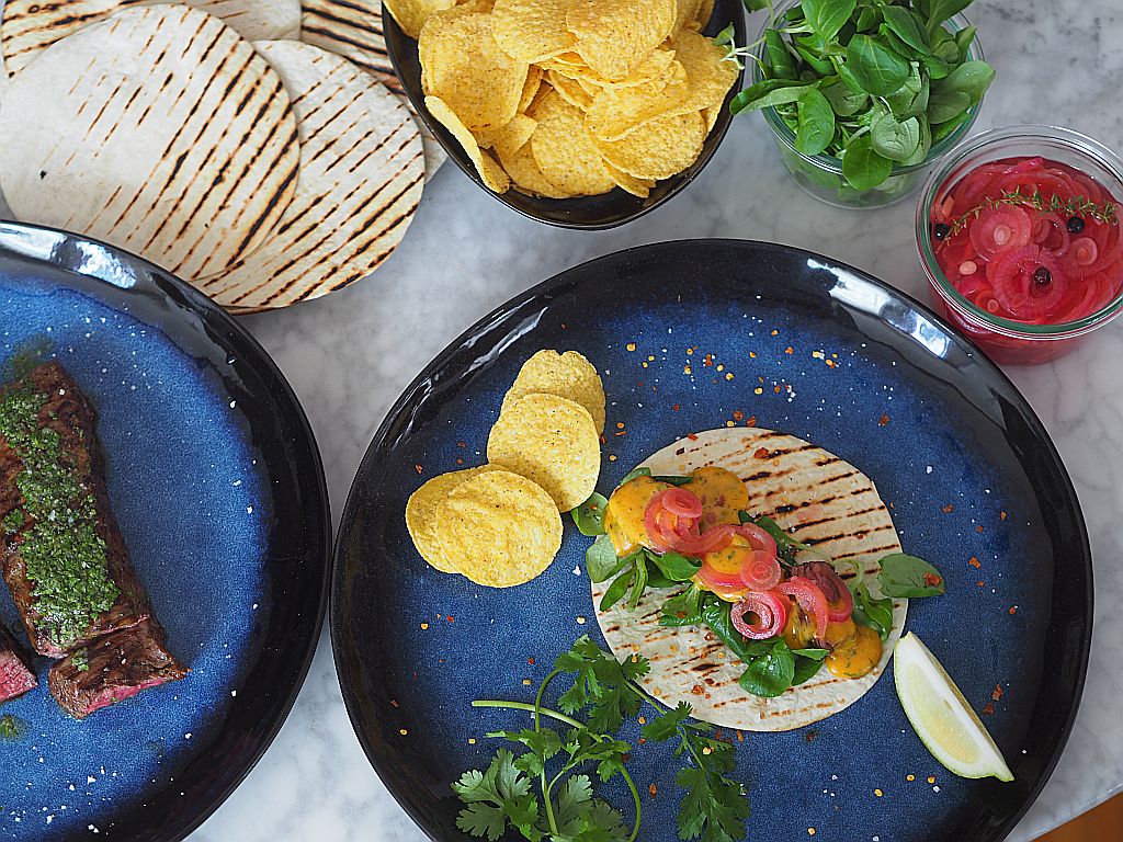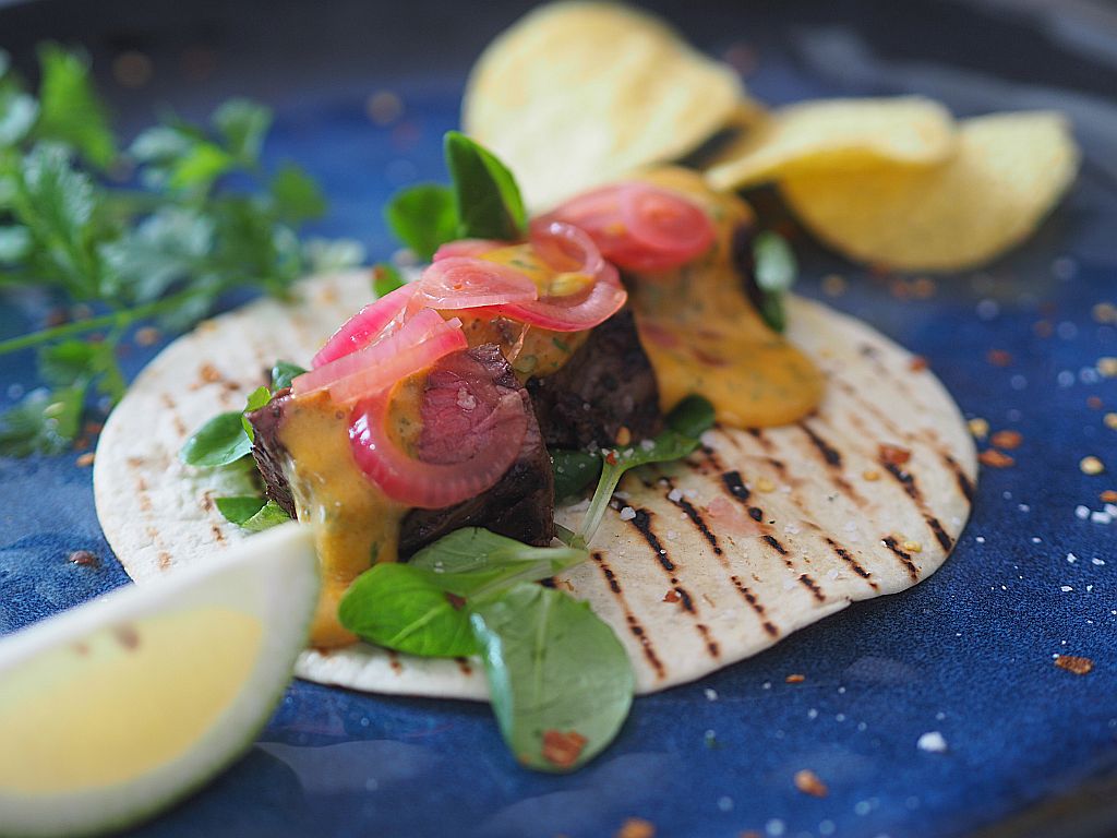 Braune Butter vorbereiten einen Viertelkilo Butter in einer kleinen Kasserole erwärmen, bis es nussbraun ist. Ergibt 150 g braune Butter. Flanksteak vorbereiten Zwei Drittel vom Flanksteak in zwei Zoll breite Streifen schneiden. Unser Flanksteak hat 1,25 kg. Das verbleibende Drittel für ein anderes Gericht beiseitelegen. Flanksteaks marinieren Für die Knoblauch-Koriander-Marinade doppelt soviel machen, wie im Buch beschrieben, da wir die Marinade auch zum Fleisch servieren. In eine Edelstahlschüssel geben: den Saft von 2 Limetten, 4 EL Olivenöl, drei geriebene Knoblauchzehen, einen TL Kreuzkümmel, frisch gemahlenen Pfeffer, 2 große Prisen Fleur de Sel und einen Bund fein gehackten Koriander und vermischen. Einen Teil davon für das Servieren auf die Seite stellen. Mit der anderen Hälfte das Flanksteak marinieren, das heißt die Flanksteaks auf einer Seite mit der Marinade bestreichen; dann die Flanksteaks nacheinander in einer genau passenden Glasschüssel einschlichten, dabei die Flanksteaks auf der anderen Seite marinieren. Den Deckel draufgeben und für zirka eine Stunde bei Zimmertemperatur ziehen lassen. Rote Zwiebeln einlegen 6 kleine rote Zwiebel in halbfeine Ringe schneiden, also nicht so fein, daß sie gleich zerfallen. 250 ml Apfelessig mit einem TL Salz und einem TL Honig vermischen und alles erwärmen, damit Salz und Honig sich auflösen. Dann in ein Weckglas geben. 8 Stück Pfefferkörner, 6 Stück Wacholderbeeren, drei halbierte Knoblauchzehen, eine halbe gelbe frische Chilischote, 4 Zweige Thymian zum Essig geben. Die Zwiebelringe in ein Sieb legen und über der Abwasch zwei Liter heißes Wasser darüber schütten. Die Zwiebelringe zum Sud ins Weckglas geben und zirka eine Stunde bei Zimmertemperatur ziehen lassen. Chili-Hollandaise 3 EL Weißweinessig, 2 EL Wasser, Salz und geschrotete schwarze Pfefferkörner auf ein Drittel reduzieren, abseihen, auskühlen lassen. Mit vier Dotter verrühren, diese Mischung auf einem Wasserbad aufschlagen, vom Wasserbad nehmen und die lauwarme braune Butter langsam mit dem Schneebesen einarbeiten. Chilipulver, geräuchertes Paprikapulver, Limettensaft und fein gehackten Koriander einrühren. Bis zum Servieren warmhalten. Flanksteak grillen auf beiden Seiten 2 Minuten in der Grillpfanne anbraten. Und bei 100° im Ofen ruhen lassen. Tortillas anbraten in der Grillpfanne. Anrichten Steak in Scheiben schneiden. Vogerlsalat auf eine Tortilla geben, drei vier Scheiben Flanksteak drauflegen, Chili-Hollandaise darauf platzieren und mit den eingelegten Essigzwiebeln belegen. Mit der Knoblauch-Koriander-Marinade und der Hollandaise servieren.
