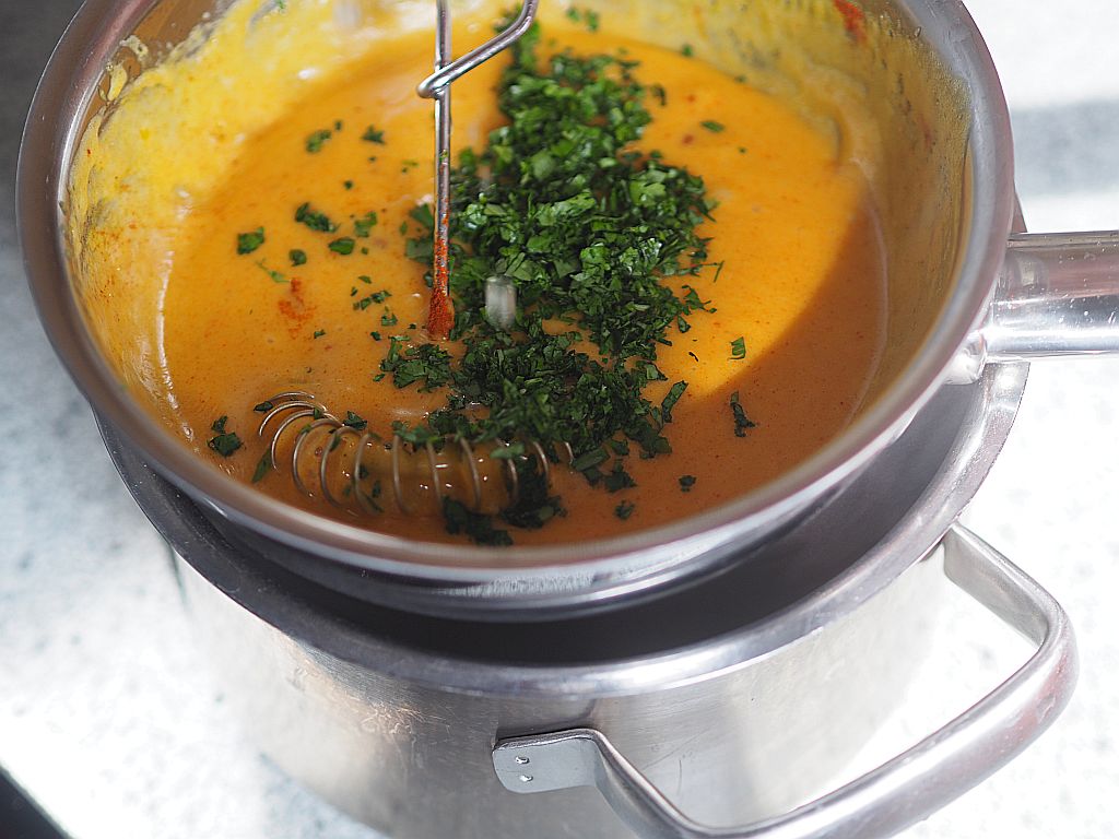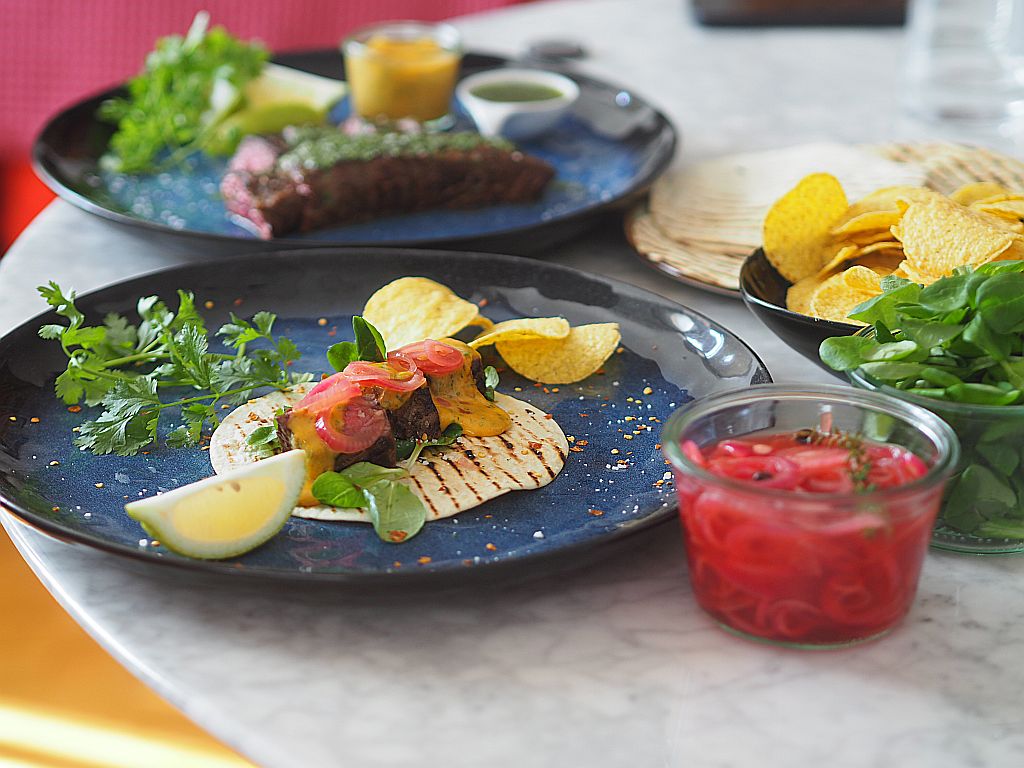 Besonders gelungen ist die Chili-Hollandaise, was wohl daran liegt, daß sie nicht auf gekauftem Ghee aufbaut, sondern röstfrisch mit Butter selbst gemacht war, die nußernen Aromen ein Gedicht! Dazu alternierend die Knoblauch-Koriander-Marinade, in die man das Flanksteak dippen konnte, das Flanksteak war so zart und kann es mit jedem Ribeye aufnehmen. Nachos und Tortillas passten gut dazu. Nur den Vogerlsalat (Feldsalat) hätte man sich sparen können. Was zu viel ist, ist zu viel.