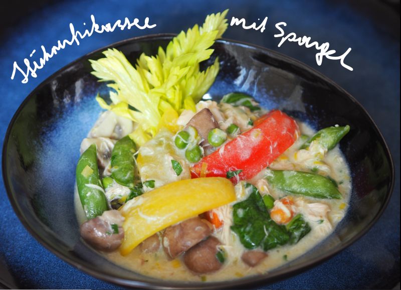 Mit Spargel. Hat man eine Suppe aus dem Packerl also aus der Tüte gemacht, dann kann man danach kein Hühner-Frikassee machen. Hat man jedoch eine Hühnersuppe unter Verwendung eines echten Huhns gemacht, wie hier für die Grießnockerlsuppe, dann geht sich hernach auch noch ein schönes Hühner-Frikassee aus.