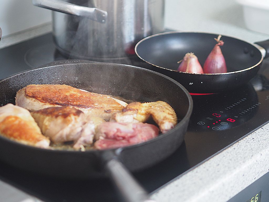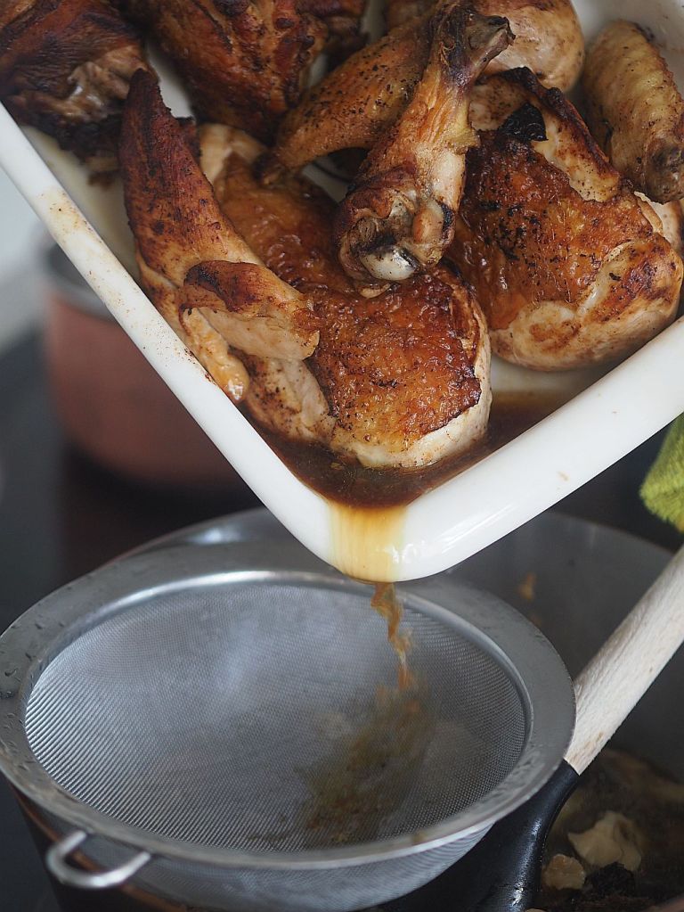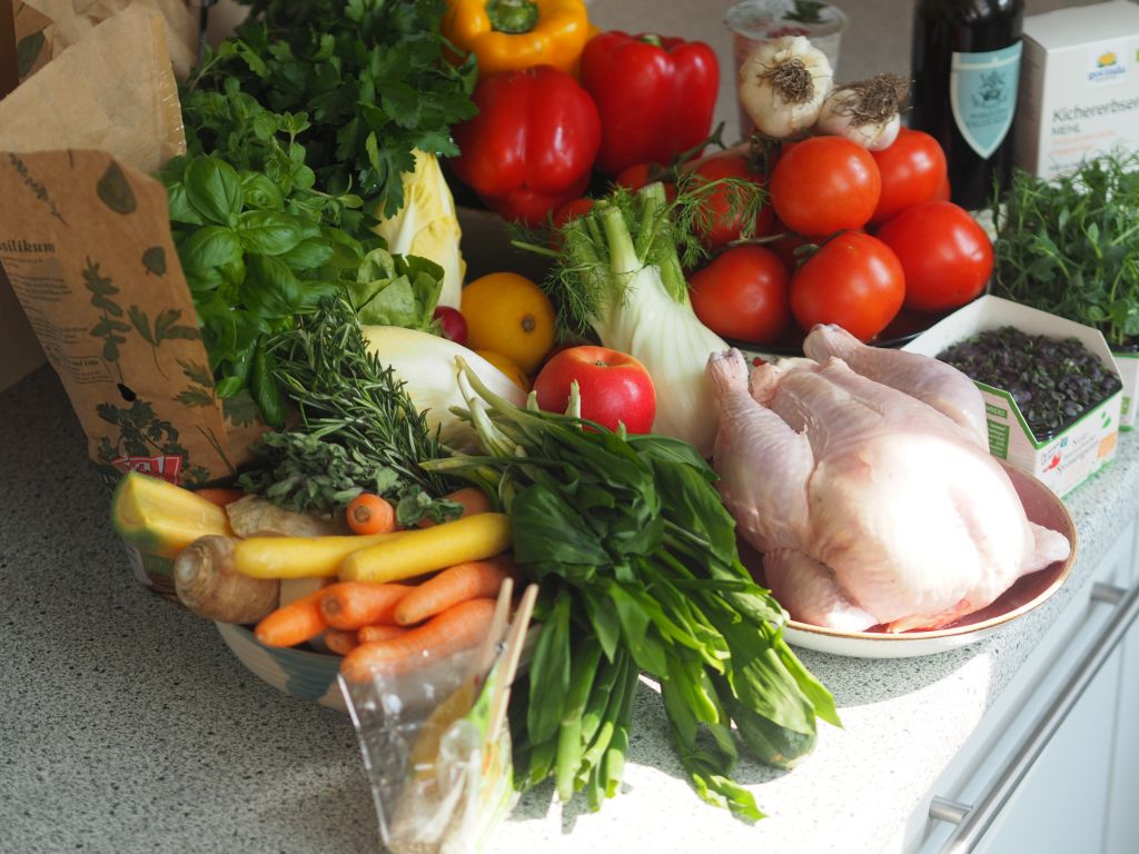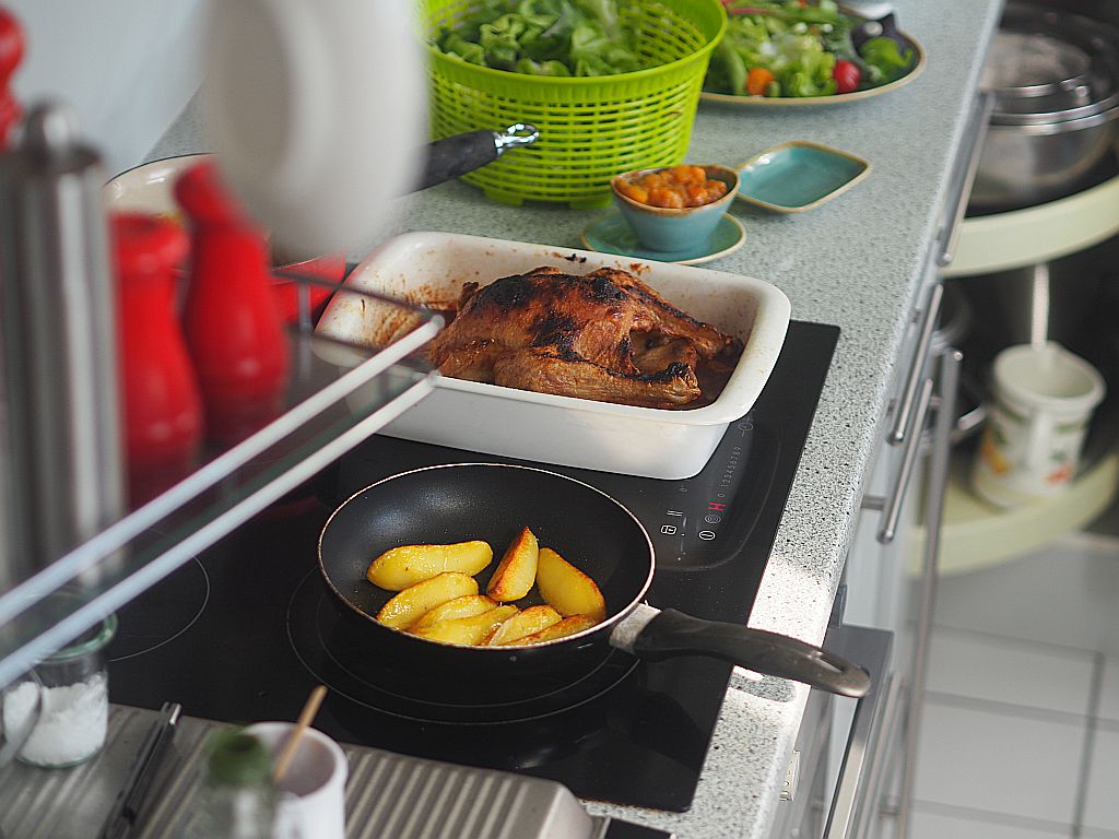 Aus den Karkassen wird Hühnerbrühe gemacht – für morgen. Da gibt es wieder Huhn! Was genau, wird nicht verraten.