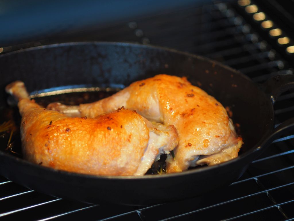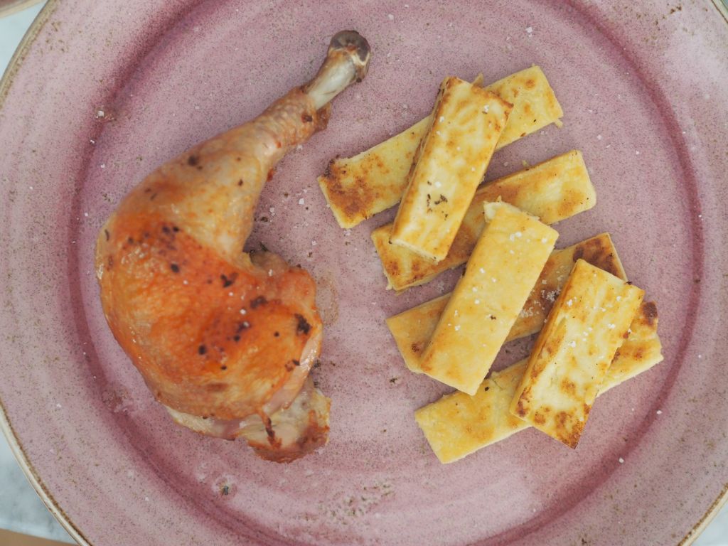 Dieses Hendl ist so knusprig so zart wie man es nicht erwartet. Ursprünglich geplant war ein Grillhuhn, doch dafür erschien uns dieses Wildhendl zu schade. So wurde es geteilt in Brust, Keule und vom Rest wurde eine wunderbare Hühnersuppe gemacht als Basis für eine Bärlauchsuppe mit Erbsen. Die Verarbeitung der Keulen stand uns als Nächstes bevor, morgen dann die Brust. Die Hühnerschenkel wurden nicht gewürzt, nur etwas Knoblauchpaste und Rosmarin kamen zum Zug; das aromatische Fleisch dieses exzellenten Huhns ist zu kostbar, um es mit Gewürzen zu überdecken. Rosmarin, weil es sich um eine mediterrane Abwandlung eines Brathuhns handelt, deshalb kamen auch die Panisses dazu, die Pommes frites der Provence.
