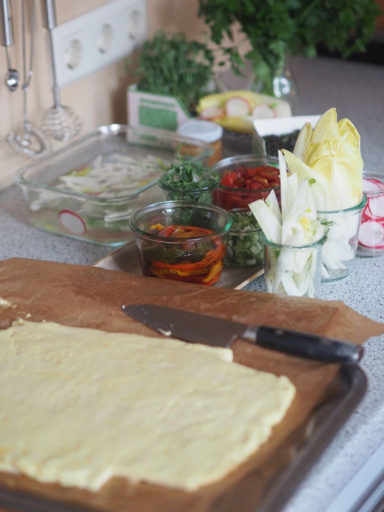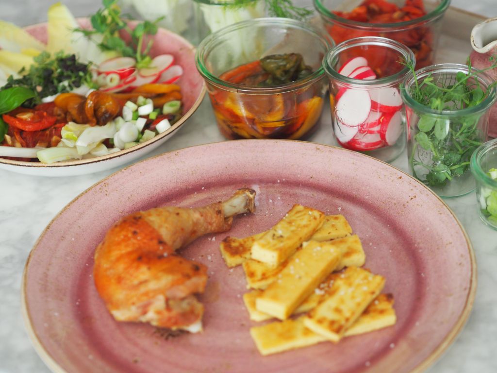 Hühnerschenkel mit Knoblauchpaste einreiben, eine gußeiserne Auflaufform mit Albaöl einfetten, mit etwas Rosmarin bestreuen, die Hühnerschenkel mit der Fleischseite nach unten darauf legen, wenig Rosmarinnadeln darübergeben und die Hühnerschenkel bei 200 Grad braten, bis sie eine goldbraune Farbe bekommen. Panisse 150 g Kichererbsenmehl mit 300 ml kaltem Wasser cremig verrühren, 300 ml Wasser mit 15 g Butter und zwei Eßlöffel Olivenöl aufkochen, die Kichererbsenmischung schön langsam unter ständigem Rühren dazu gießen und bei mittlerer Hitze, eine Viertelstunde unter ständigem Rühren köcheln lassen. Anschließend in eine mit Backpapier belegte und mit Olivenöl bestrichene viereckige Form gießen, mit einem mit Olivenöl benetzten Tortenheber verteilen. 5 Stunden im Kühlschrank ruhen lassen. Vor dem Servieren herausnehmen, in pommes-frites-förmige Stücke schneiden, und in Albaöl auf allen Seiten anbraten. Gemüse in Scheiben geschnittene Radieschen, in dünne Scheiben und kaltes Wasser gelegte Fenchel, gegrillte Paprika, getrocknete Tomaten, Chicorée-Salat, Erbsen- und Pak-Choi-Sprossen.