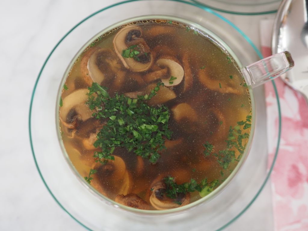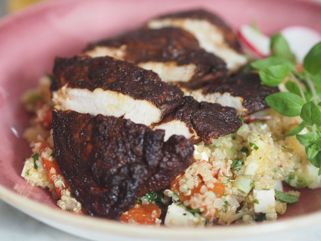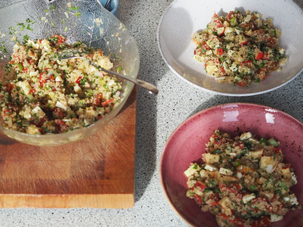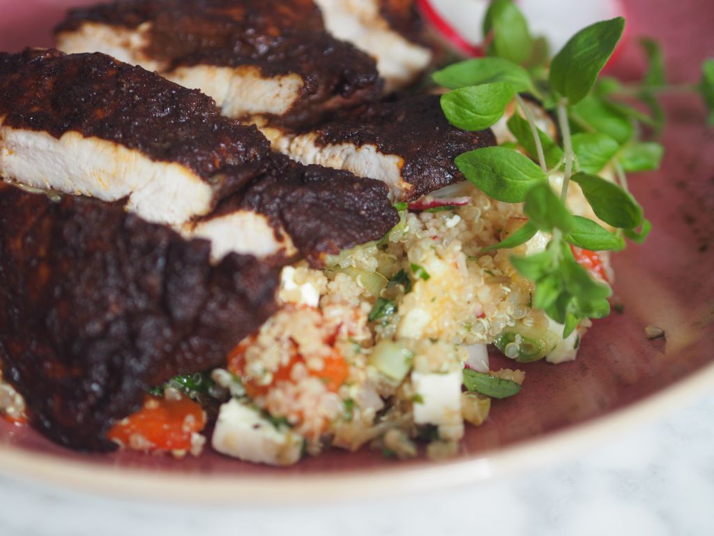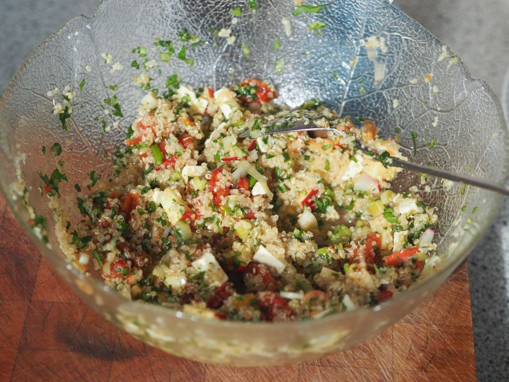 Das übrig gebliebene gegrillte Gemüse von gestern wurde unter den Quinoa gehoben. Weiters wurde es mit gehacktem Majoran, Basilikum und Petersilie vermischt. Die Hühnerbrust wurde mit einem Gemisch aus Piment, geräuchertem Paprikapulver und Olivenöl eingerieben und in der gußeisernen Auflaufform im Backrohr gebraten. Somit wurde das ganze Huhn verarbeitet, die ersten Schritte siehe hier. Als erster Gang schon in der Früh als Frühstück gab es eine Champignonsuppe mit Erbsen und Karotten auf Basis einer Hühnersuppe.