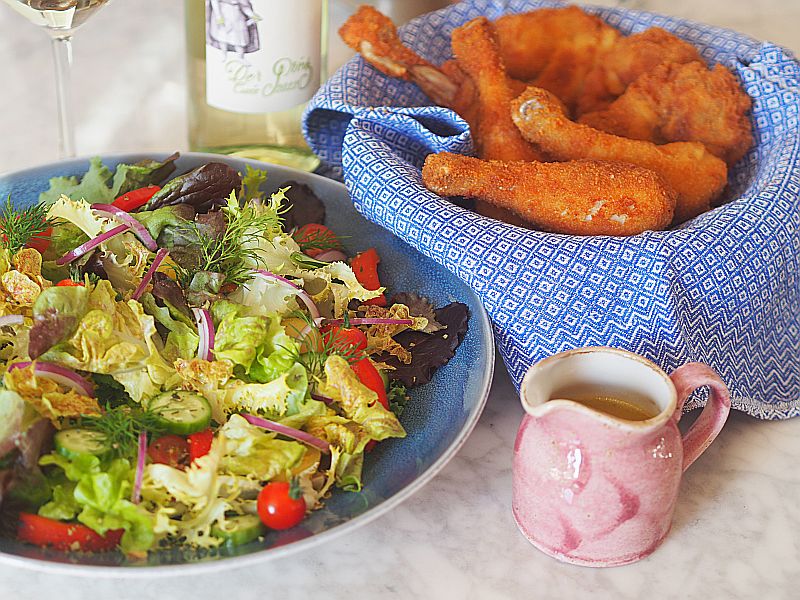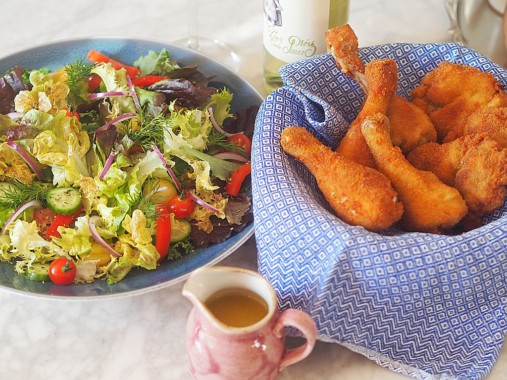 Ober- und Unterschenkel vom steirischen Henderl o.H. salzen und pfeffern, dann durch eine Panierstation mit Dinkelmehl, Eier und feine Dinkelbrösel ziehen. In eine Pfanne mit hohem Rand ca. 2 cm Bratolivenöl und Schweineschmalz geben, erhitzen, wenn heiß die Henderlkeulen hineingleiten lassen. Ca. 5 Minuten backen lassen, bis es schön goldbraun ist. Herausheben, auf Küchenkrepp abtropfen lassen und in ein mit einem Blaudruck-Brotkorbdeckchen ausgelegten Körbchen legen. Anrichten: Mit Salat servieren.