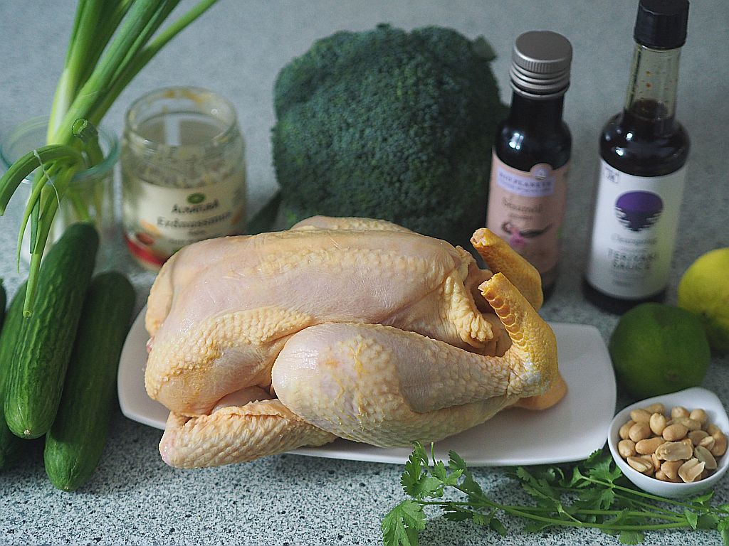 Das Huhn tranchieren, die Brust und die Schenkel enthäuten und entbeinen. In längliche Streifen schneiden und über Nacht in Teriyaki-Soße marinieren. A m n ä c h s t e n T a g die Hühnerstreifen auf einem Holzspieß aufspießen. Und in der Pfanne rundum braten. In einen Bräter geben, mit Teriyaki-Soße beträufeln im Backrohr bei 180°C 10 Min, durchgaren. B e i l a g e n Haselnußcreme eine fein gehackte Zwiebel in Sesamöl anschwitzen. 2 geriebene Knoblauch dazugeben. 2 EL Wasser, 150 g Haselnuß-Pesto hineingeben, vom Herd nehmen, cremig rühren, wenn nötig, noch etwas kaltes Wasser hineingeben. Mit Salz und Limettensaft abschmecken. Gurken in längliche Streifen schneiden, Jungzwiebel in dünne Ringe schneiden. Mit Limettensaft, Teriyaki-Soße vermischen und ziehen lassen. Beim Anrichten ein paar Tropfen „sriracha“-Soße daraufgeben. Brokkoli in Salzwasser blanchieren.