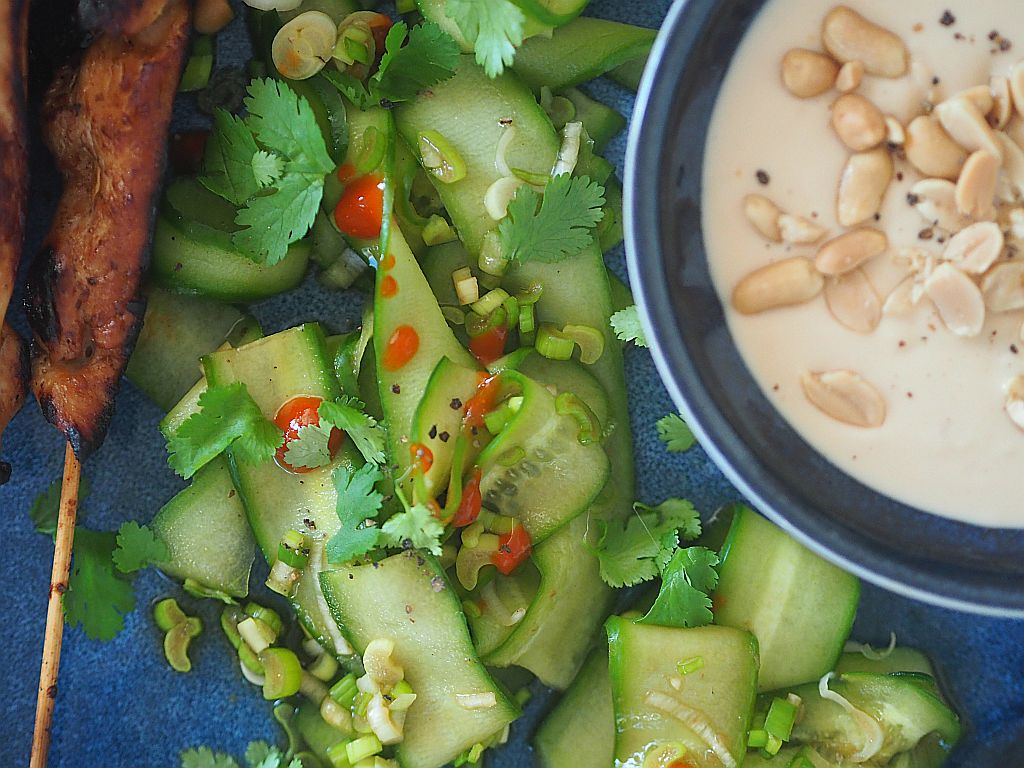 Gurken von Blün sind wieder da. Was kann man damit machen? Saté-Spieße hatten wir schon lange nicht. Das Huhn kommt aus Les Landes, der zweiten großen Region Frankreichs für Hühner. Auch hierfür gibt es reichlich Rezepte bei Alain Ducasse. Aber keine Saté-Spieße. Die wurden auf diese Weise gemacht: