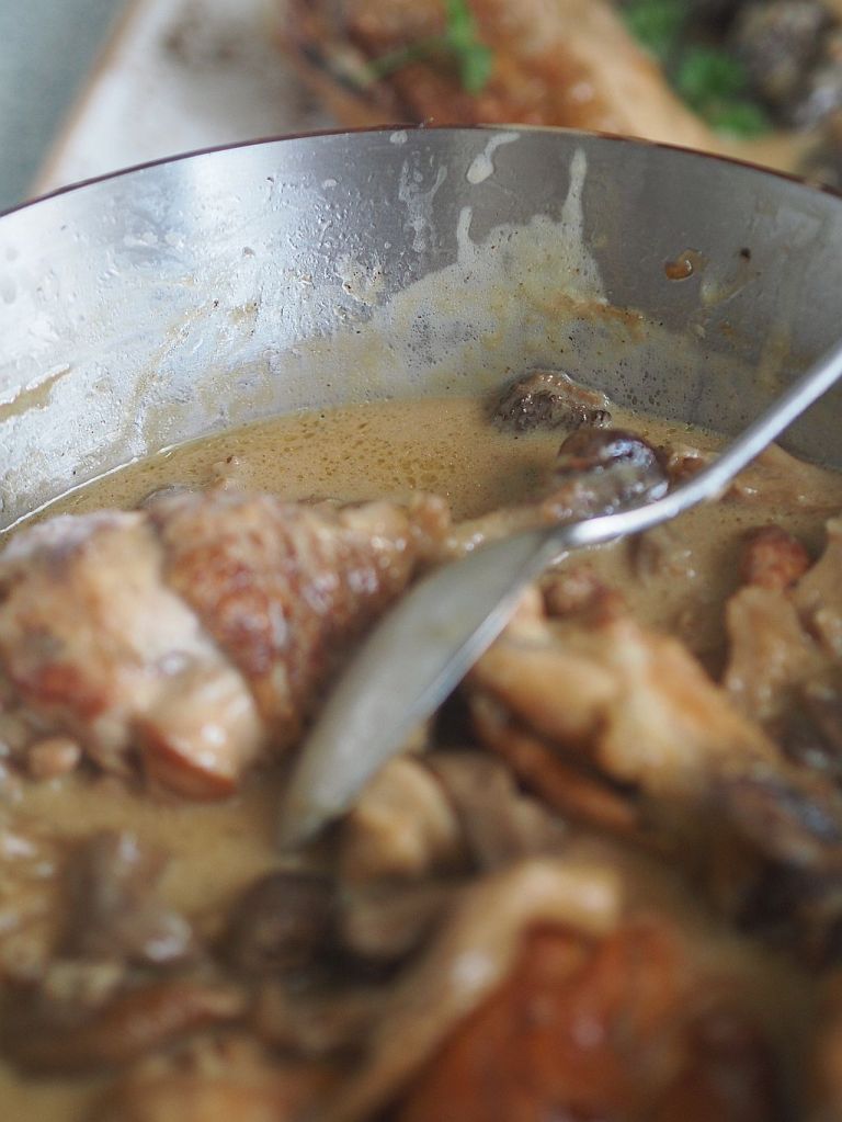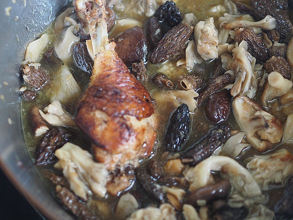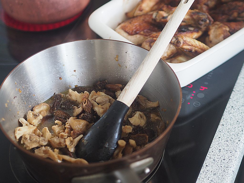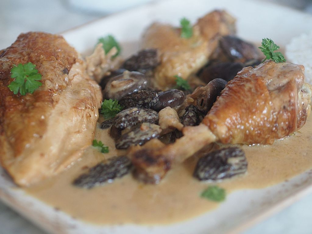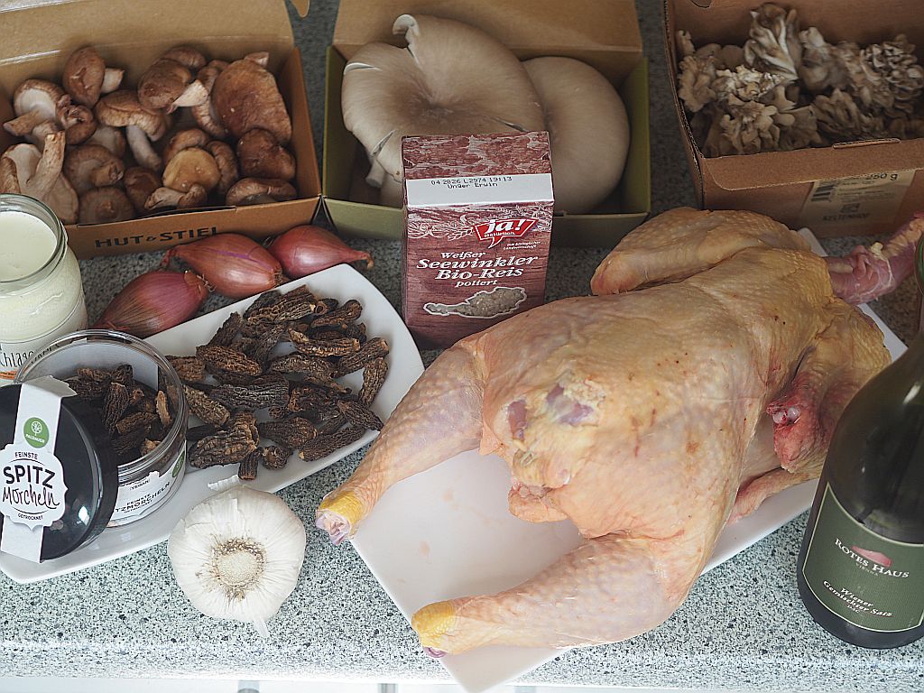 Das Huhn (2,4 kg) in Schenkel, Brust und Flügel aufteilen. Die Schenkeln in Ober- und Unterschenkeln aufteilen. Aus der restliche Karkasse eine Hühnerbrühe machen. Die Hühnerstücke salzen. Olivenöl und Butter in der Panne erwärmen. Die Hühnerstücke auf der Hautseite in die Pfanne legen. 5 zerdrückte Knoblauchzehen hineingeben. Rundum anbraten. Die Fleischstücke herausheben und in einen Bräter geben und bei 120°C im Backrohr durchgaren. In der Zwischenzeit 4 kleine Schalotten kleinhacken, in einer Oliven-Buttermischung anschwitzen. Die eingeweichten und ausgedrückten Morcheln hineingeben. Gleichzeitig 150 g Shiitake-Pilze, 150 g Austernpilze und 250 g Tanzpilze in einer kleinen Pfanne mit Olivenöl braten. Und zu den Morcheln geben. Wenn alle Pilze zusammen sind, mit einem großen Schuß Noilly Prat ablöschen. Den Herd zurückdrehen und zugedeckt 20 Min. garen. Einen halben Liter Hühnerbrühe zu den Pilzen gießen. 300 ml Mattigtaler Schlagobers dazugeben. Ein wenig mit Stärke binden. Dann die Hühnerstücke aus dem Backrohr nehmen und in die Soße legen. Zugedeckt 10 Min. ziehen lassen. Mit Salz abschmecken.