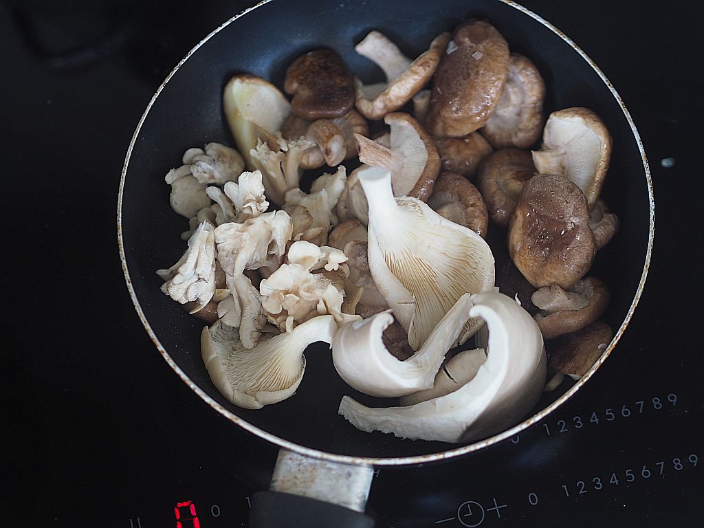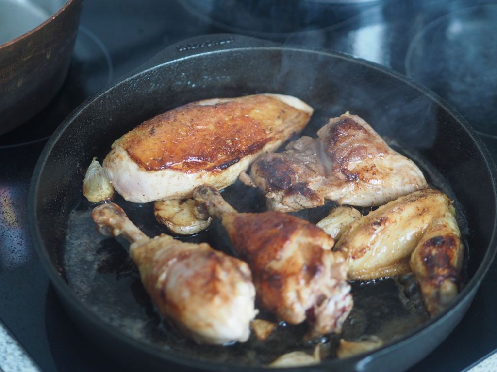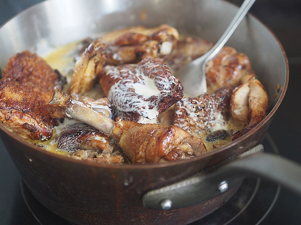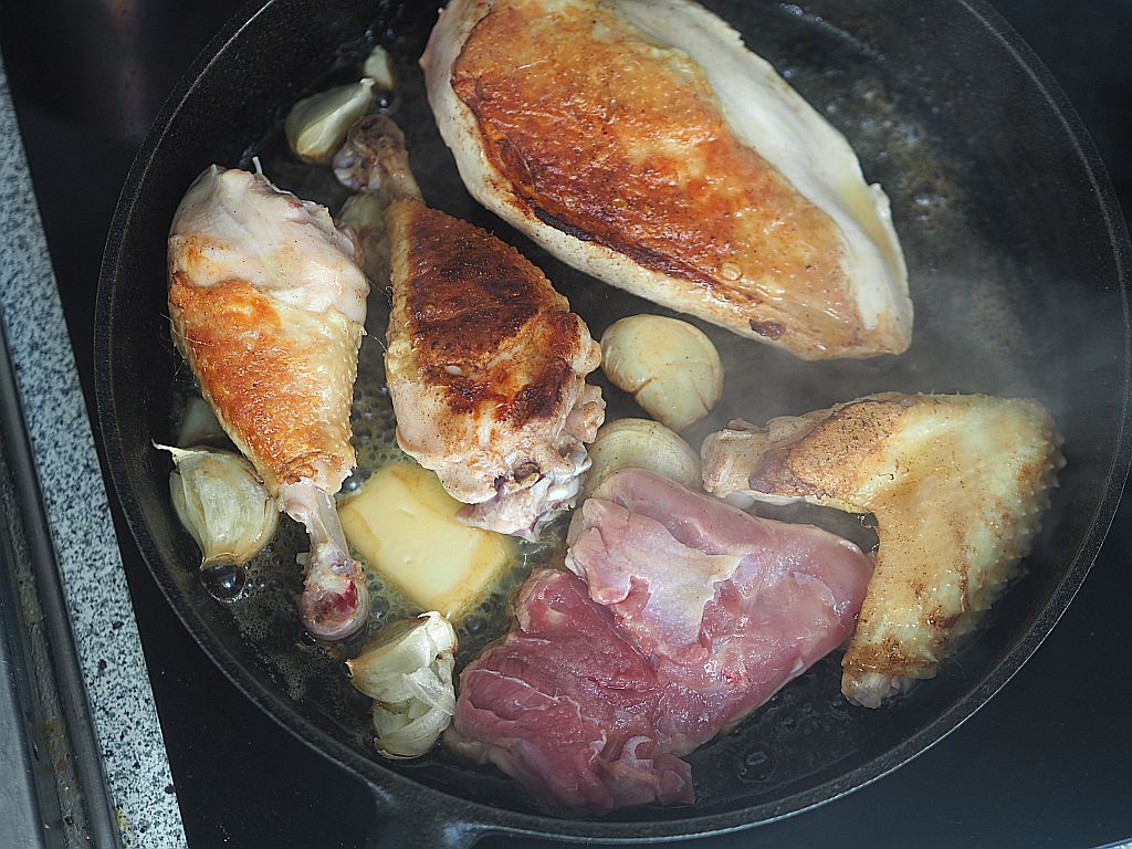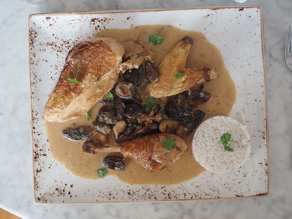 Das Huhn (2,4 kg) in Schenkel, Brust und Flügel aufteilen. Die Schenkeln in Ober- und Unterschenkeln aufteilen. Aus der restliche Karkasse eine Hühnerbrühe machen. Die Hühnerstücke salzen. Olivenöl und Butter in der Panne erwärmen. Die Hühnerstücke auf der Hautseite in die Pfanne legen. 5 zerdrückte Knoblauchzehen hineingeben. Rundum anbraten. Die Fleischstücke herausheben und in einen Bräter geben und bei 120°C im Backrohr durchgaren. In der Zwischenzeit 4 kleine Schalotten kleinhacken, in einer Oliven-Buttermischung anschwitzen. Die eingeweichten und ausgedrückten Morcheln hineingeben. Gleichzeitig 150 g Shiitake-Pilze, 150 g Austernpilze und 250 g Tanzpilze in einer kleinen Pfanne mit Olivenöl braten. Und zu den Morcheln geben. Wenn alle Pilze zusammen sind, mit einem großen Schuß Noilly Prat ablöschen. Den Herd zurückdrehen und zugedeckt 20 Min. garen. Einen halben Liter Hühnerbrühe zu den Pilzen gießen. 300 ml Mattigtaler Schlagobers dazugeben. Ein wenig mit Stärke binden. Dann die Hühnerstücke aus dem Backrohr nehmen und in die Soße legen. Zugedeckt 10 Min. ziehen lassen. Mit Salz abschmecken.