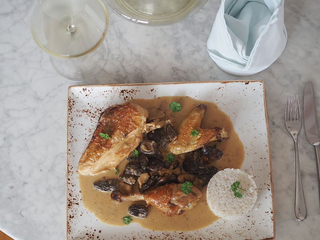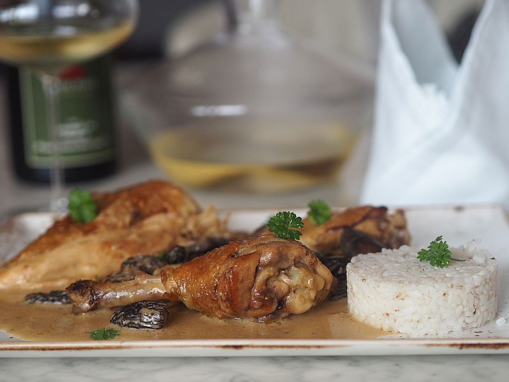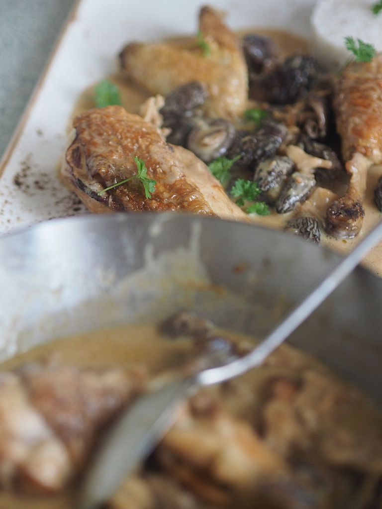 Aufgezogen im nördlichen Waldviertel, für uns, von uns Wohlgesonnenen, lassen wir diesem Haushuhn eine spezielle Behandlung angedeihen. Es gibt ein Rezept mit Hühnerfrikassee mit Morcheln, das wir schon seit geraumer Zeit gerne machen würden, was aber immer wieder am Fehlen von Morcheln gescheitert ist; – und an der Ermangelung eines Huhnes, das dessen würdig ist. Heute ist es soweit. Damit befinden wir uns endgültig im Reich der Glückseligen.