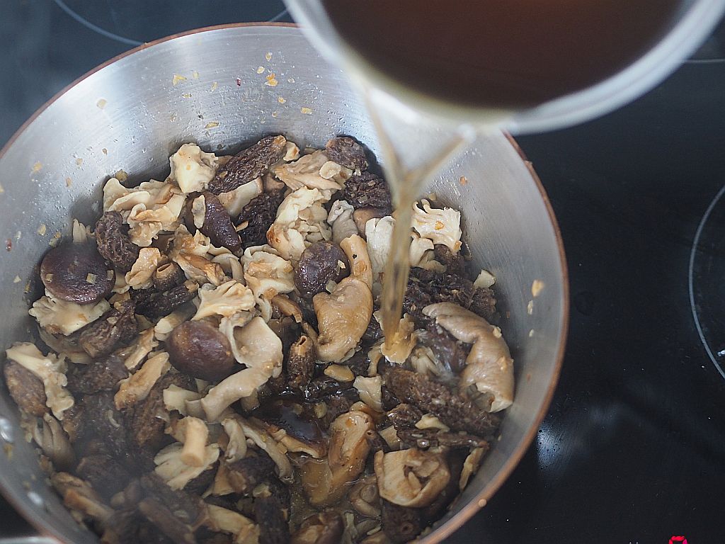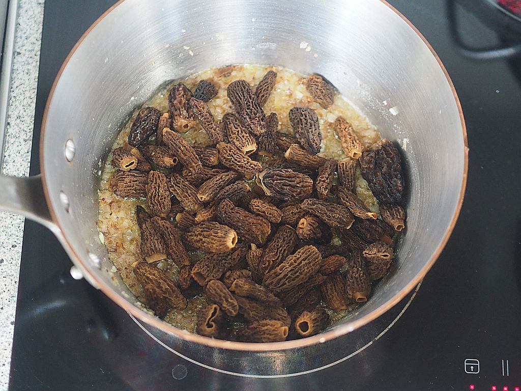 20 Min. 40 g getrocknete Morcheln in lauwarmes Wasser zum Ziehen legen.