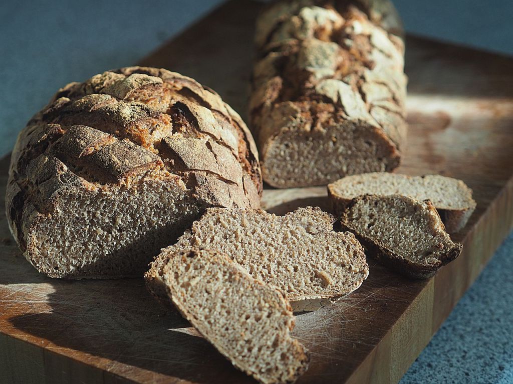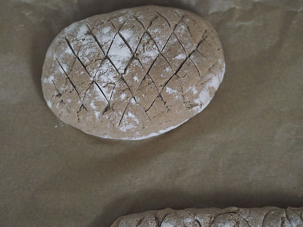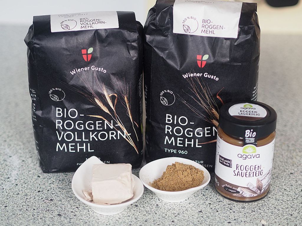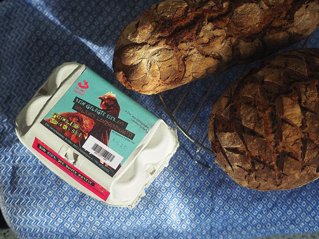 Wir haben mehrmals schon versucht, einen Sauerteig mit einer Hefemutter Livieto madre anzusetzen. Man muß ihn regelmäßig füttern, doch immer wieder verhungerte er uns, wir haben keinen Kopf dafür; selbst als wir ihm Namen gaben, ließen wir den armen Hermann verkommen. Wenn wir dann in Pension sind… Nun haben wir uns einen fertigen Roggensauerteig gekauft. Und daraus hat die Hofköchin zwei Roggenbrote gemacht, mit Roggenvollkorn- und Roggenmehl nach Rezepten aus dem Mikrobiombuch. Klopft man auf das Brot und es hört sich hohl an, ist es fertiggebacken. Frischer geht es nicht, die Kruste kracht und es schmeckte überraschend gut! Man kann tatsächlich zu Hause Brot backen. Geht ganz leicht.