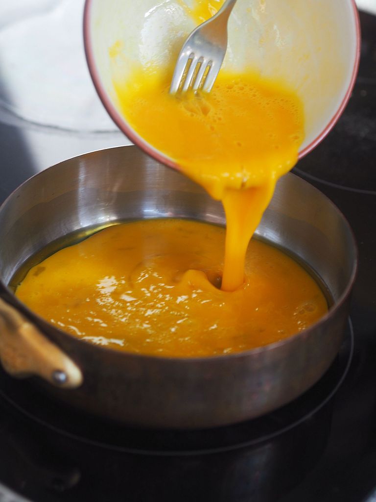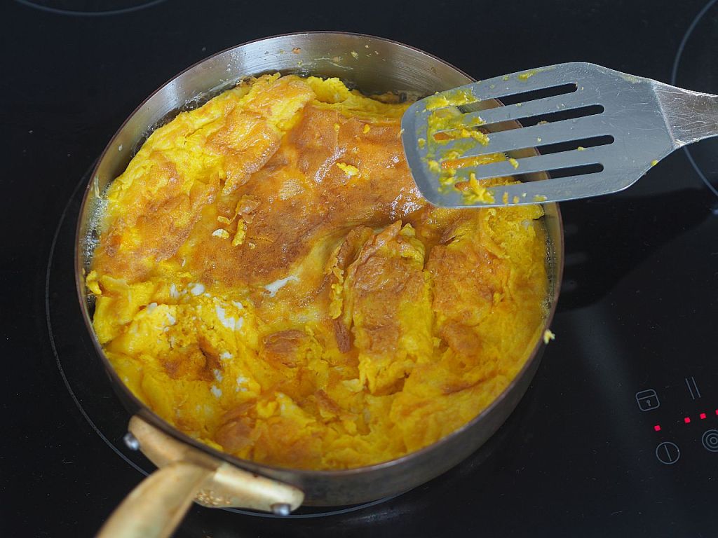 Rezept: Die Eier mit einer geringen Menge Salz, eine Prise nur, vermischen, und auf Butterschmalz in einer Pfanne bei mittlerer Hitze herausbraten, ohne umzurühren. Wenn es stockt, den flüssigen Teil unterheben.