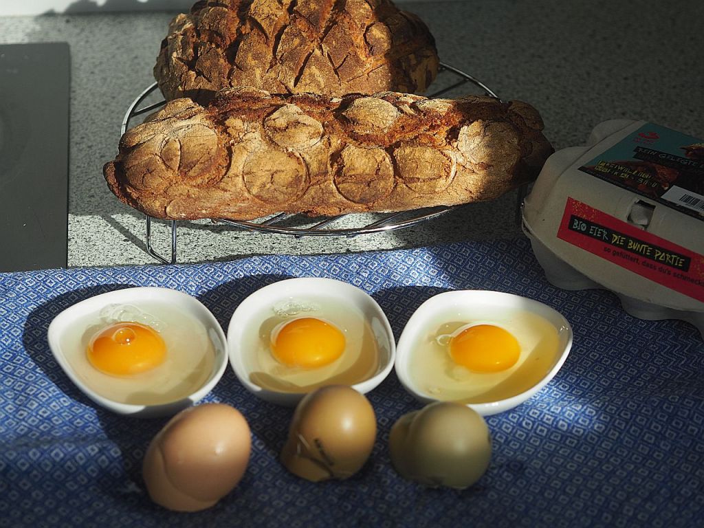Diese Eier schmecken gut, fast ohne Salz und doch sind sie schmackhaft, wie wir das erwartet haben. Die Eierspeise war schaumig und fest, die Eier gehen gut auf, wir werden sie für die Wochenend-Eierspeise wieder nehmen.