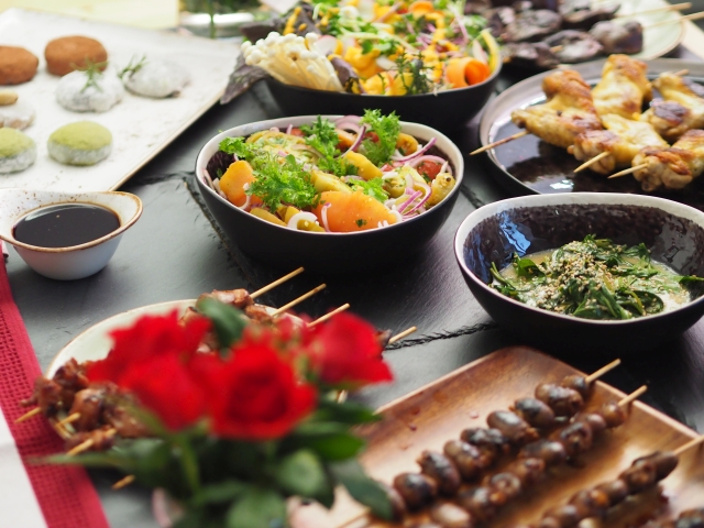 Yakitori mit Wasserspinat-Miso-Sesam Salat, Tomaten-Ceviche, Sakura-Salat. Dazu eine Teriyaki-Sauce . Yakitori: Hühnerkeulen, Hühnermägen, Hühnerflügel, Hühnerherz, Hühnerleber.