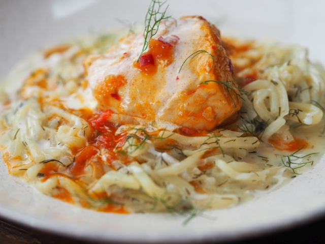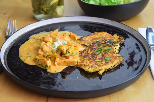 Geschnetzelte Supremes in einer Paprika-Rahm-Sauce mit Pastinaken-Puffer und Endiviensalat.