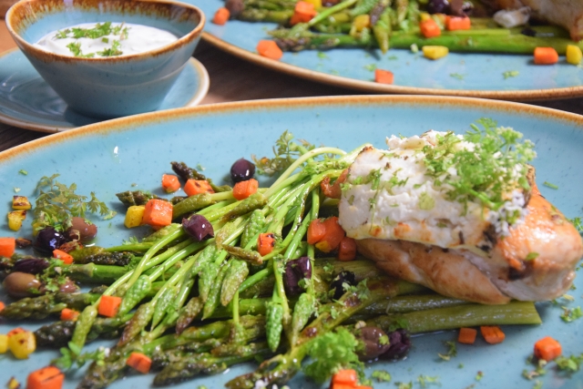 Gegrillte Hühnerbrust mit grünem Spargel und Wildspargel, Karotten, Zitronendressing. Dazu ein Kerbel-Frischkäse-Dip. Einfach köstlich. So spielt das Leben. So darf es.