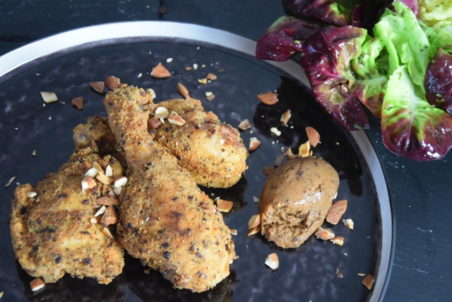Saftige Oberkeulen und Unterkeulen mit einer Panier aus Mandelmehl und Kräutern, mit geräucherten Mandelstückchen bestreut. Dazu gemischter Salat und Pflaumensenf. Das ist kein Wiener Backhendl. Die Panier geht mehr in Richtung paleo und es ist nicht ausgelöst. Wir haben nur die Keulen vom Huhn verwendet, die Hühnerbrüste wurden am Vortag zu Hühnerspießen verarbeitet. Der Rest kam in den Suppentopf.